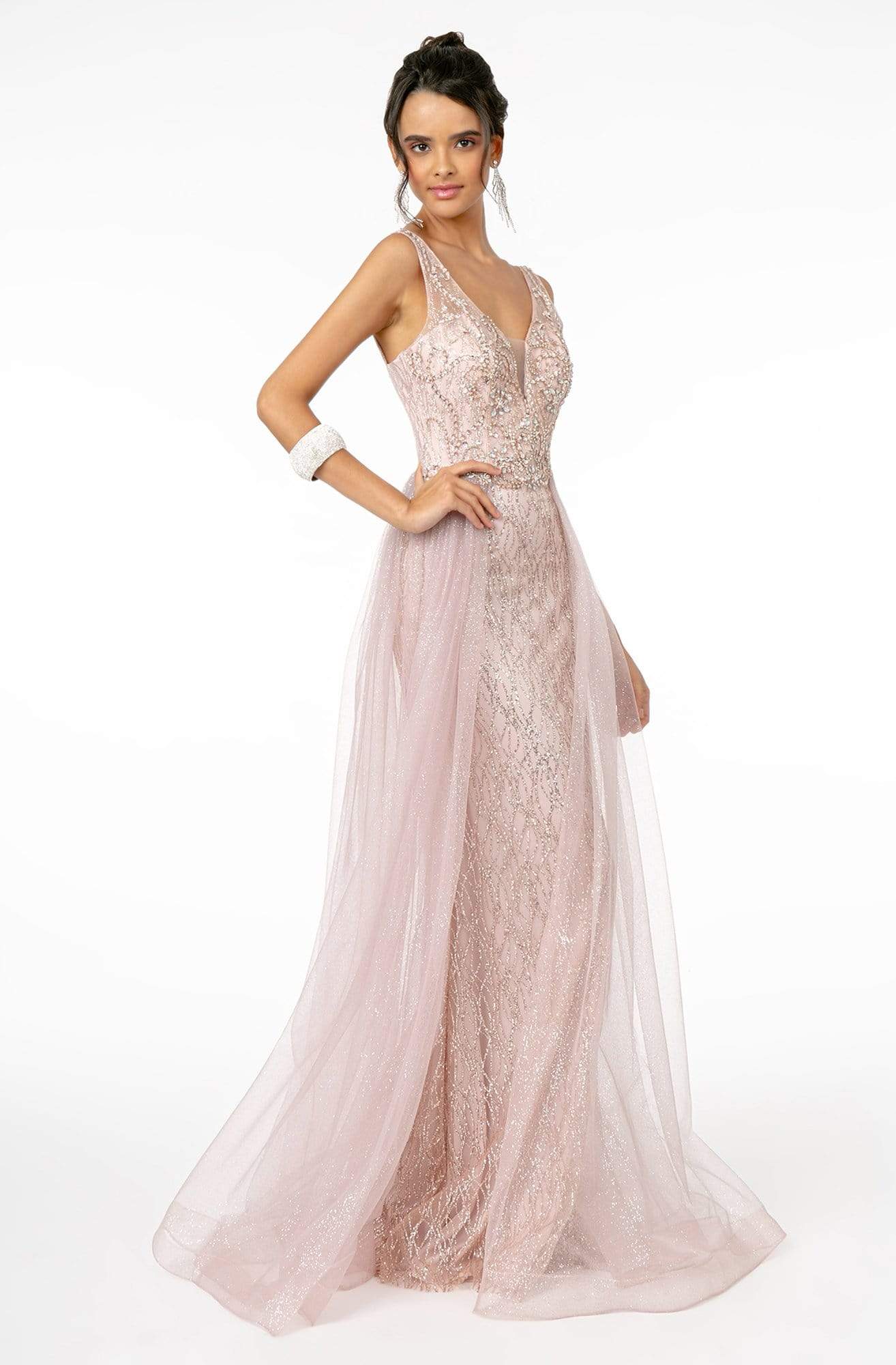 Let your beauty stand out while looking so exquisite in this GLS by Gloria GL184 creation. Embellished with shimmering jewels on a sleeveless bodice, this piece features a plunging v-neckline with an illusion inset. Defined with shoulder straps to craft a square-cut back, the glinting A-line skirt flows into a full-length silhouette. A sheer overskirt commences from the waist and drapes into a sweep of train. Fall in love with the romance of this GLS by Gloria masterpiece.