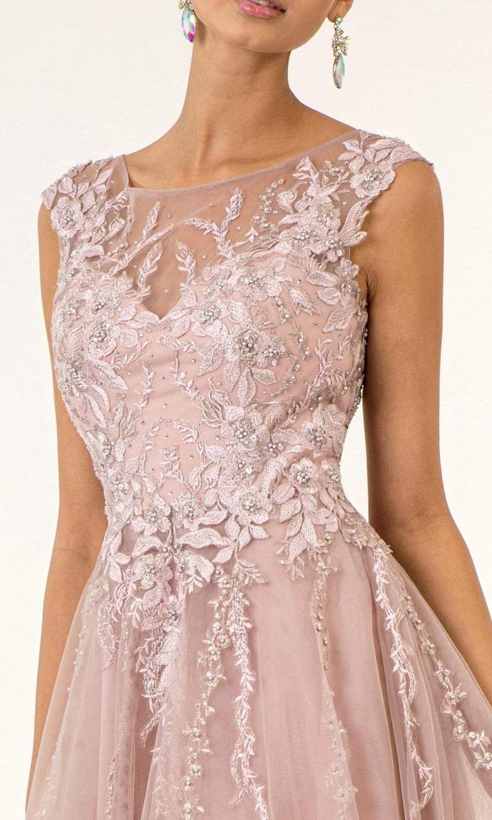Have them follow you with appreciative stares in this GLS by Gloria GL1923 creation. Blooming with floral embroidered details, beads and sequins, this stunner shows an illusion jewel neckline. Framed with cap sleeves and accented with an illusion back, the ornate skirt flows lavishly into a frothy train. Dazzle from head to toe in this sumptuous Elizabeth K masterpiece.