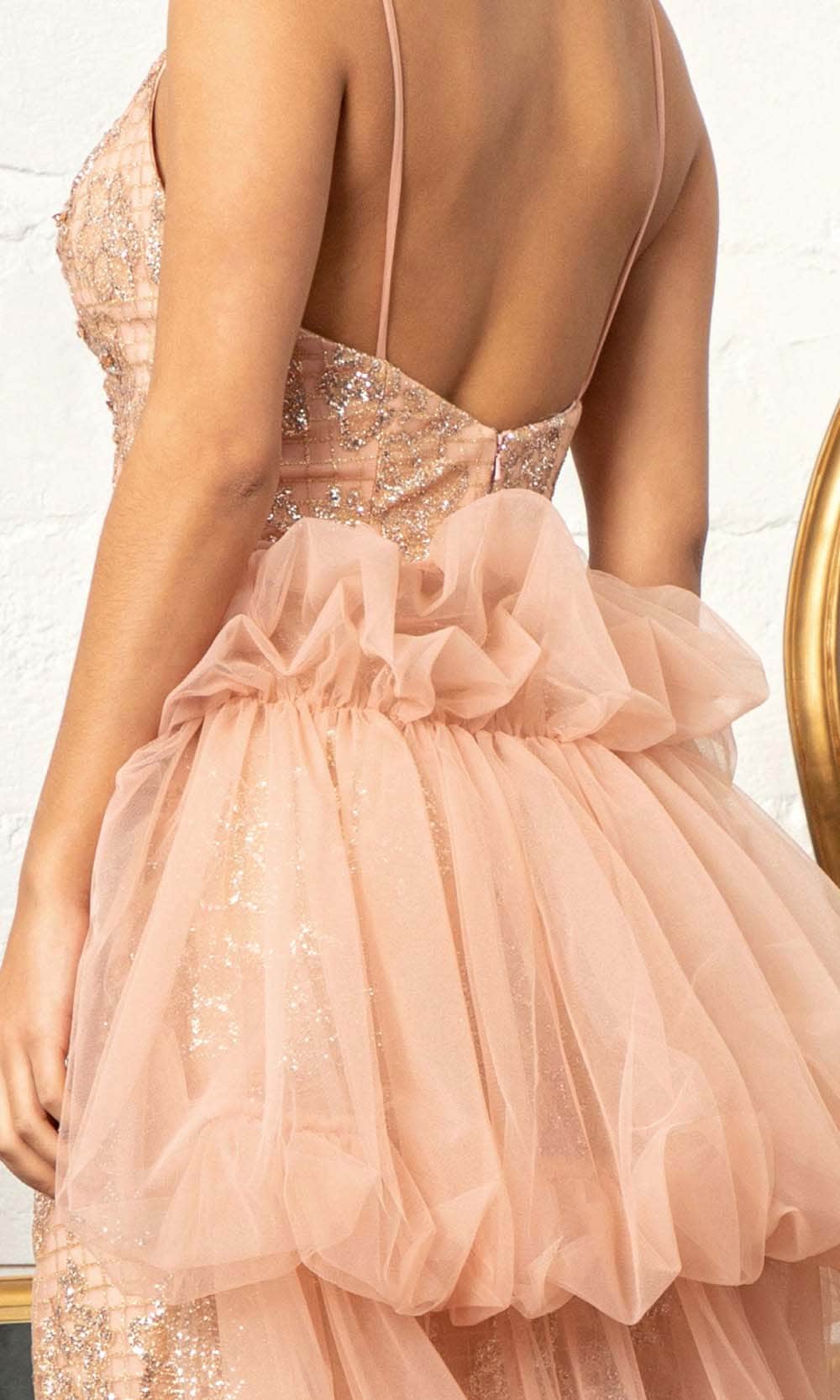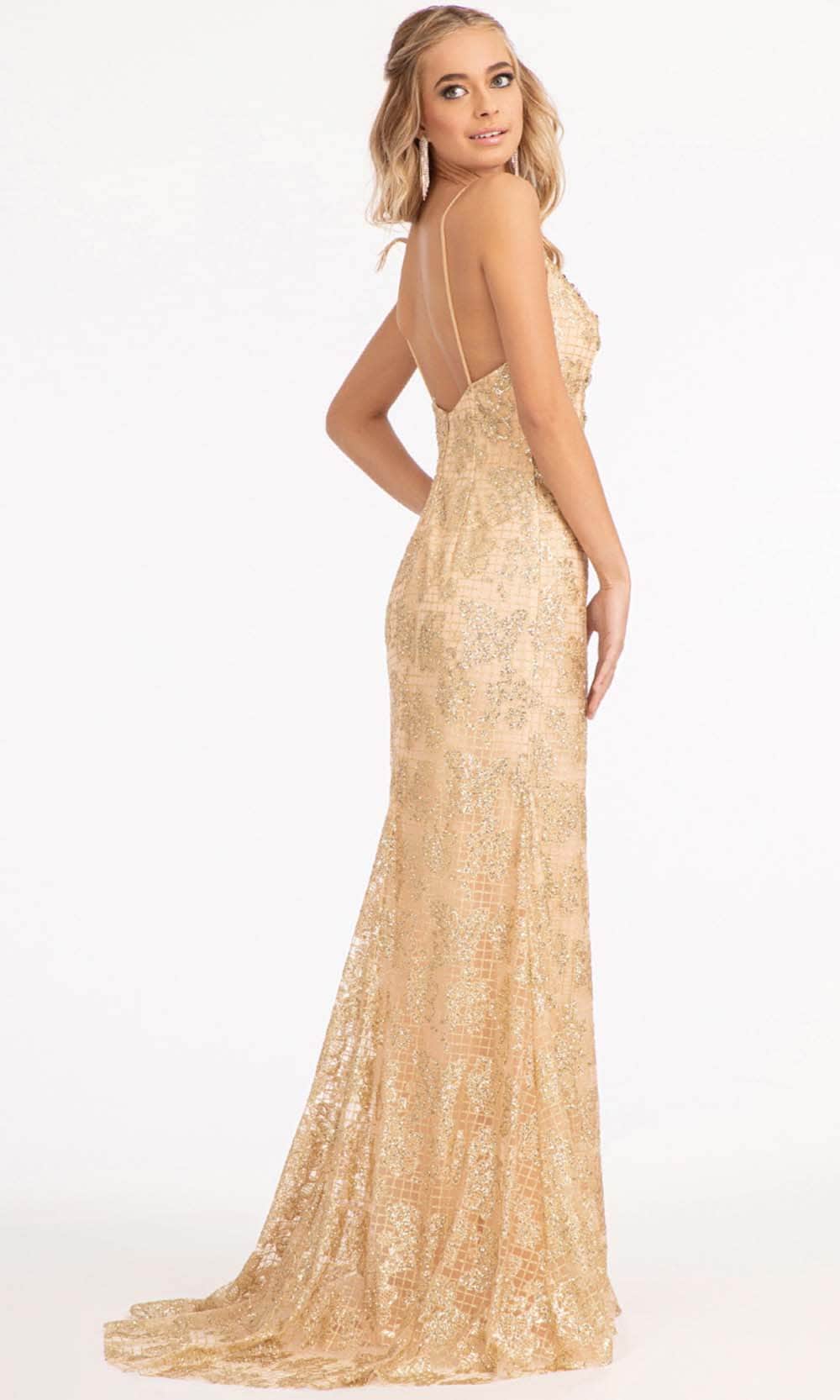 Turn yourself into a head-turning sensation by slipping into this utterly fetching GLS by Gloria GL3004. Shimmers graciously in a glittered figure-hugging dress, this beauty is styled in a sleeveless fitted bodice with low scoop neckline supported by thin straps leading to an alluring open back secured by a zipper closure. The dress is accented with interesting asymmetrical cutouts across the bodice enclosed by sheer mesh. A high leg slit compliments the skirt as it slips into beautiful sheath silhouette with puffy sheer tail at the back for added drama and gracefully ends with a court train. This GLS by Gloria collection is sure to get you noticed. Models are wearing Rose Gold and Champagne colors.