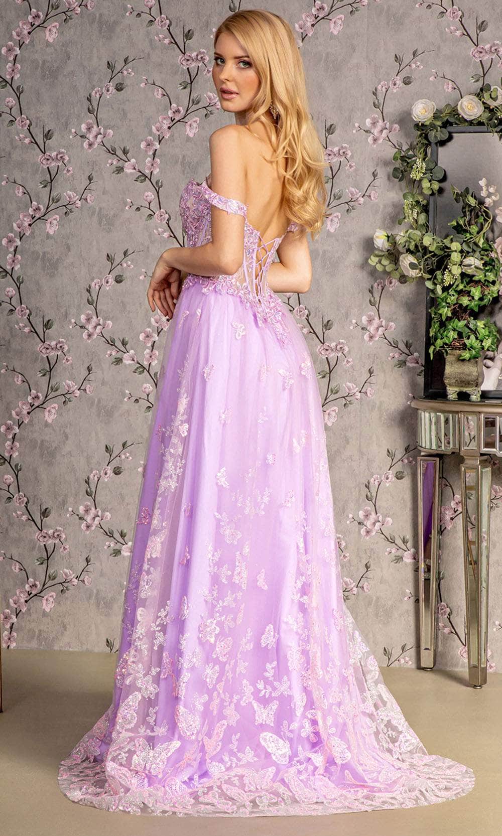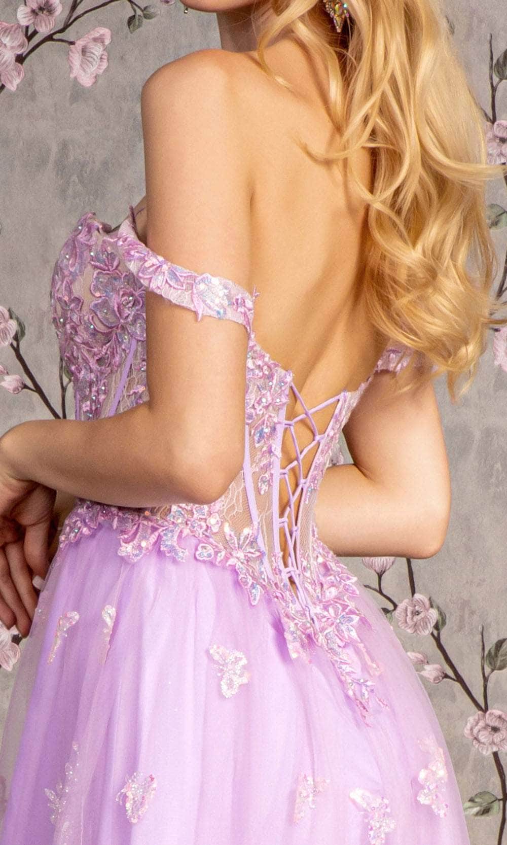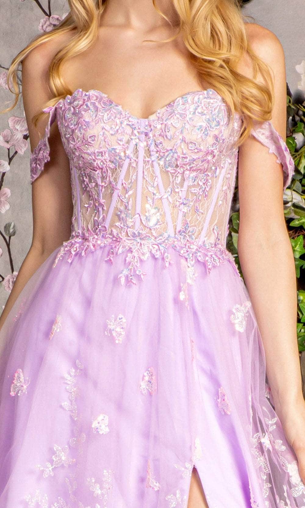 Transform into a vision of ethereal beauty with grace in this enchanting GLS by Gloria GL3206 evening dress. The gown features a charming off-shoulder neckline on a fitted illusion corset bodice, creating a captivating silhouette. The mid-open back is elegantly adorned with lace, adding a touch of refinement. Crafted with a combination of beads, embroidery, and sequins, the dress ensures an alluring and charming look. A high slit enhances the mesmerizing A-line silhouette, flowing down to the floor length. Capture the fascination of everyone with your grace and beauty in this captivating GLS by Gloria GL3206 creation. Model is wearing Lilac color.
