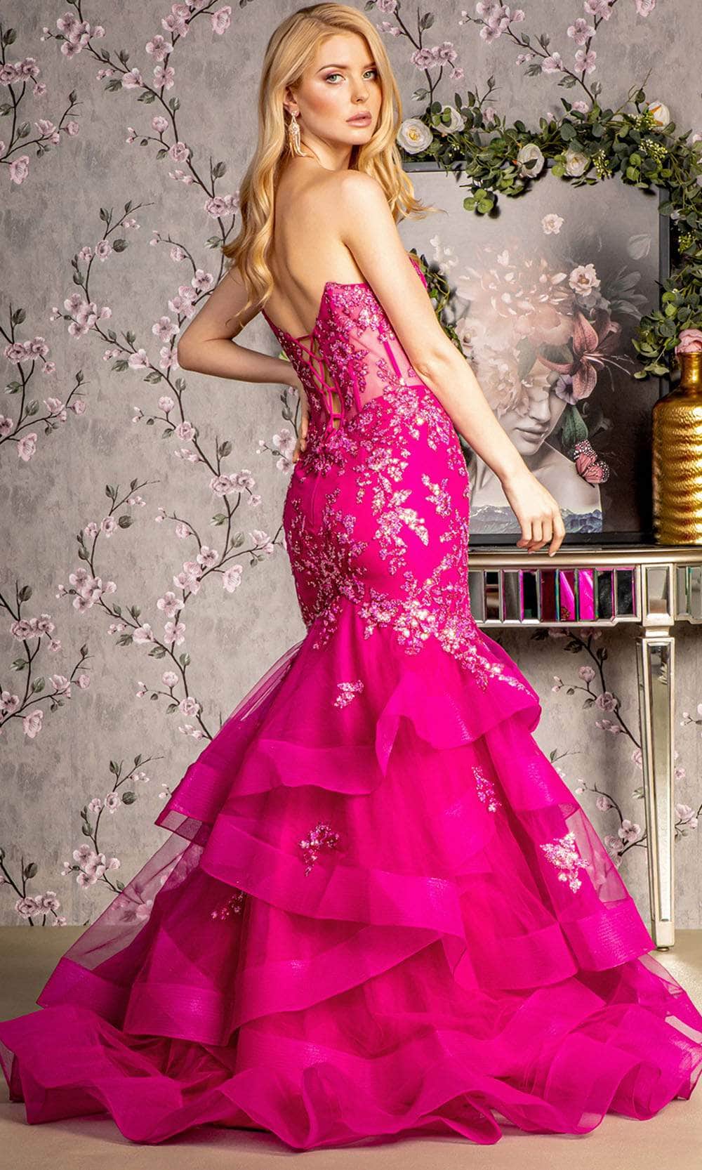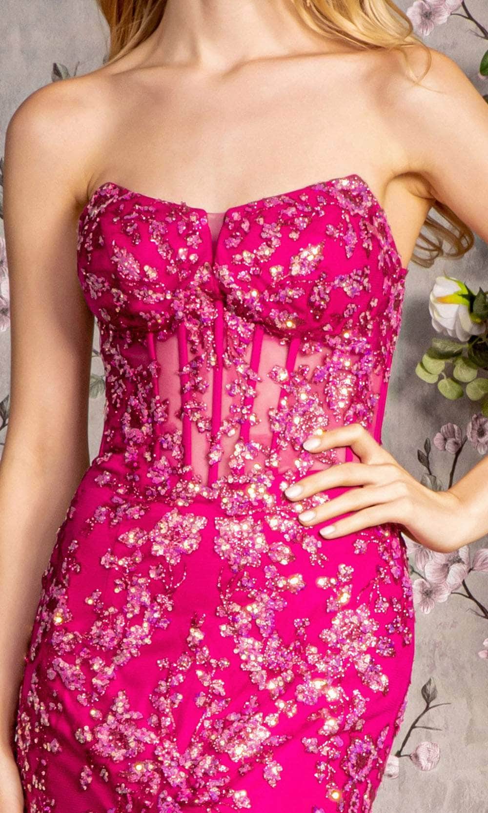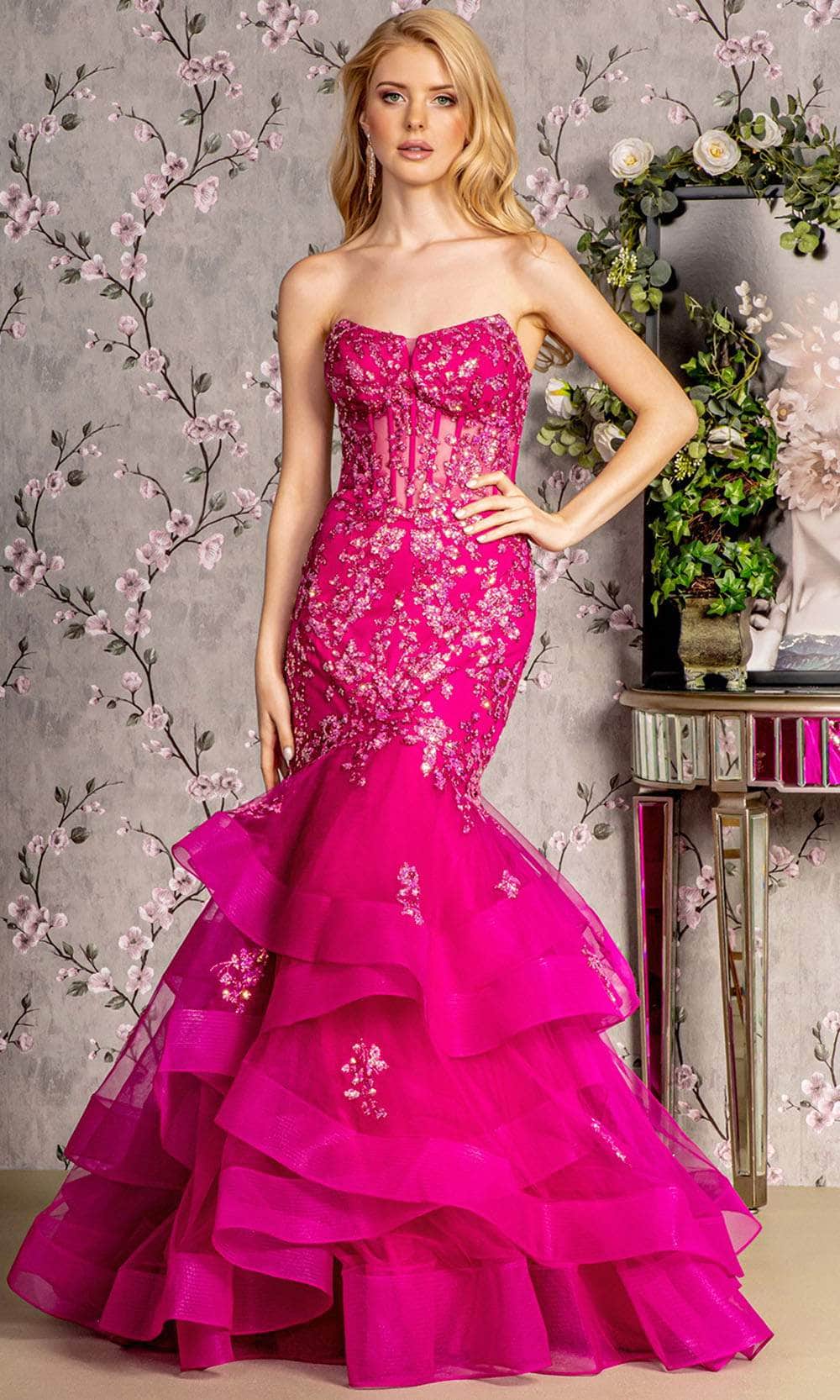 Radiate glamour in GLS by Gloria GL3216, an exquisite sequin sheer bodice gown with a captivating design. The strapless sheer corset bodice is adorned with sequins, showcasing intricate details, and crowned with a scoop neckline. A lace-up tie, complemented by a central zipper closure, ensures a secure fit. The floor-length trumpet skirt, with a ruffled mesh overlay, gracefully extends into a train, adding a touch of drama to this enchanting ensemble. This GLS by Gloria GL3216 seamlessly combines modern flair and timeless elegance, making it a stunning choice for any special occasion. Model is wearing Magenta color.