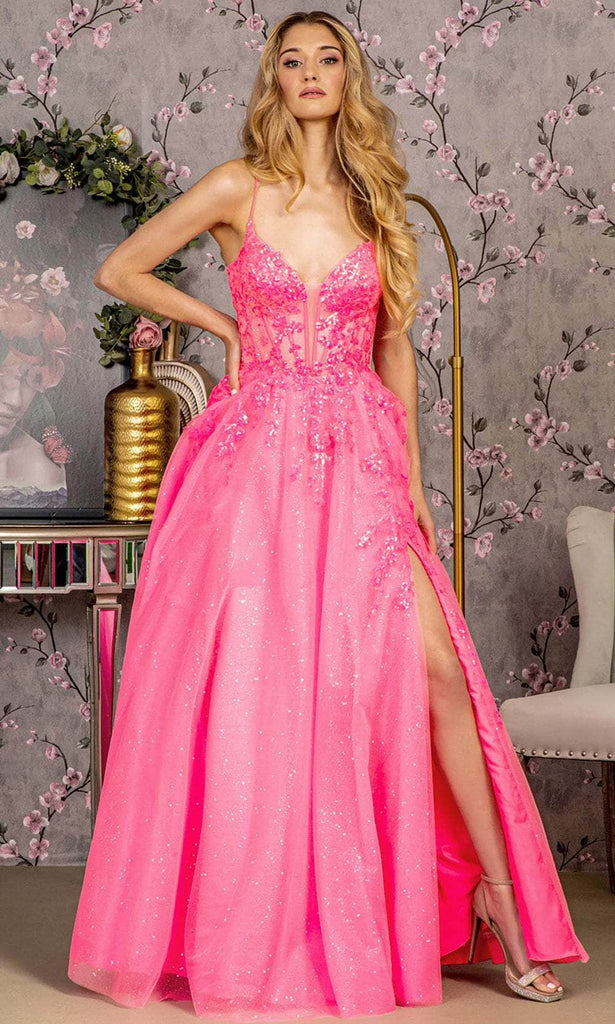 Embrace bold elegance with this captivating GLS by Gloria GL3218 evening dress. The dress features a charming sweetheart neckline on a well-fitted corset bodice, accompanied by spaghetti straps for added support. The mid-open back is intricately styled in a crisscross manner, secured by lace for a graceful finish. Furthermore, this masterpiece is adorned with glitters and sequins, ensuring you look exceptionally spectacular. A slit is also unveiled on the floor-length A-line skirt, adding allure to the entire ensemble. Make a statement with instant attitude in this GLS by Gloria GL3218 creation. Models are wearing Black, and Hot Pinks colors.