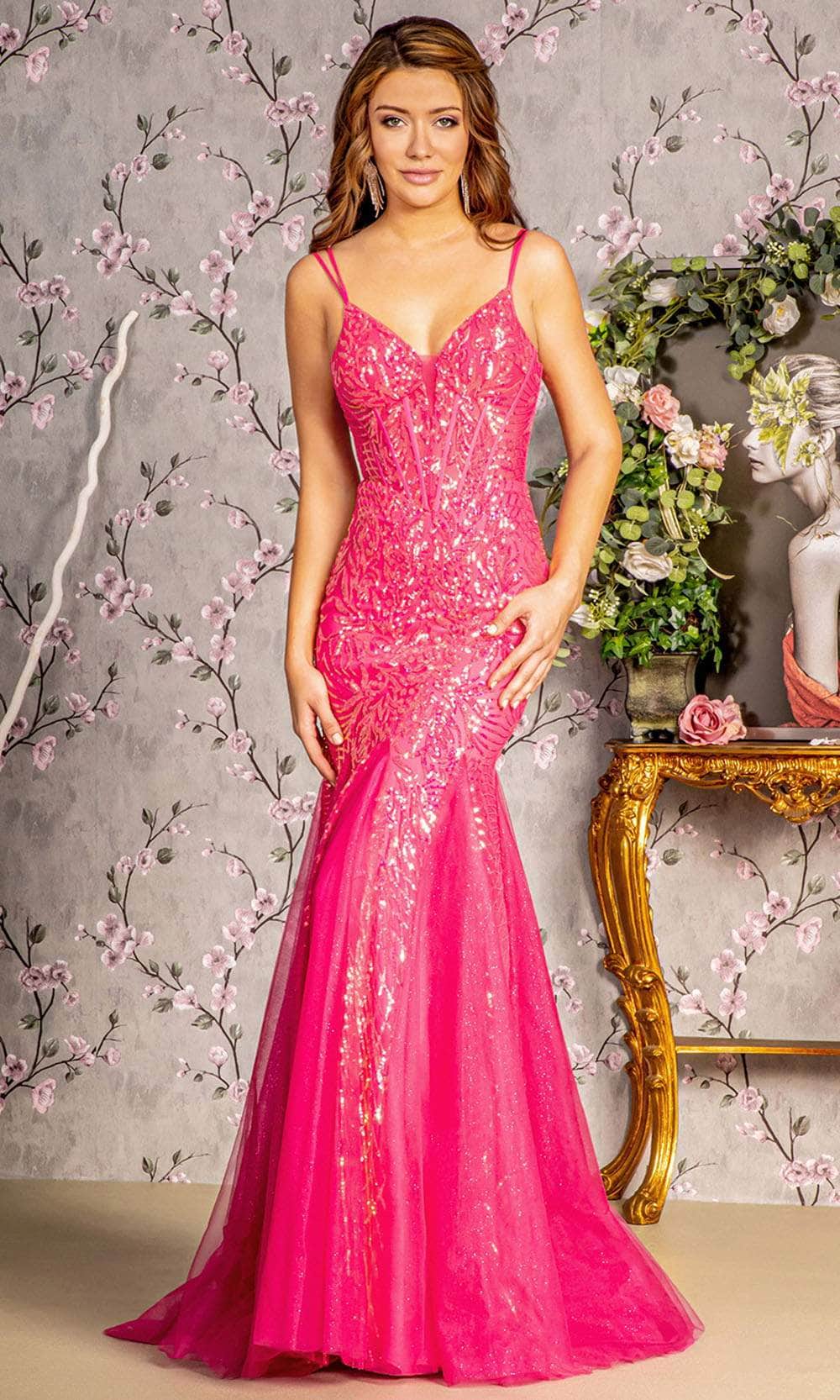 Showcase your glamorous side in this lovely GLS by Gloria GL3228, a mesmerizing sequin illusion sweetheart gown that embodies glamour. The sleeveless sheer bodice, embellished with sequins, features a captivating sweetheart neckline. Supported by double straps, it leads to a lace-up back and central zipper closure for a secure fit. The floor-length mermaid skirt flows gracefully, concluding with a train for extra allure. This GLS by Gloria GL3228 effortlessly melds modern elegance with timeless charm, offering a radiant choice for any special occasion. Model is wearing Hot Pink color.