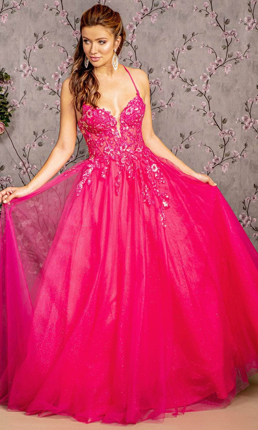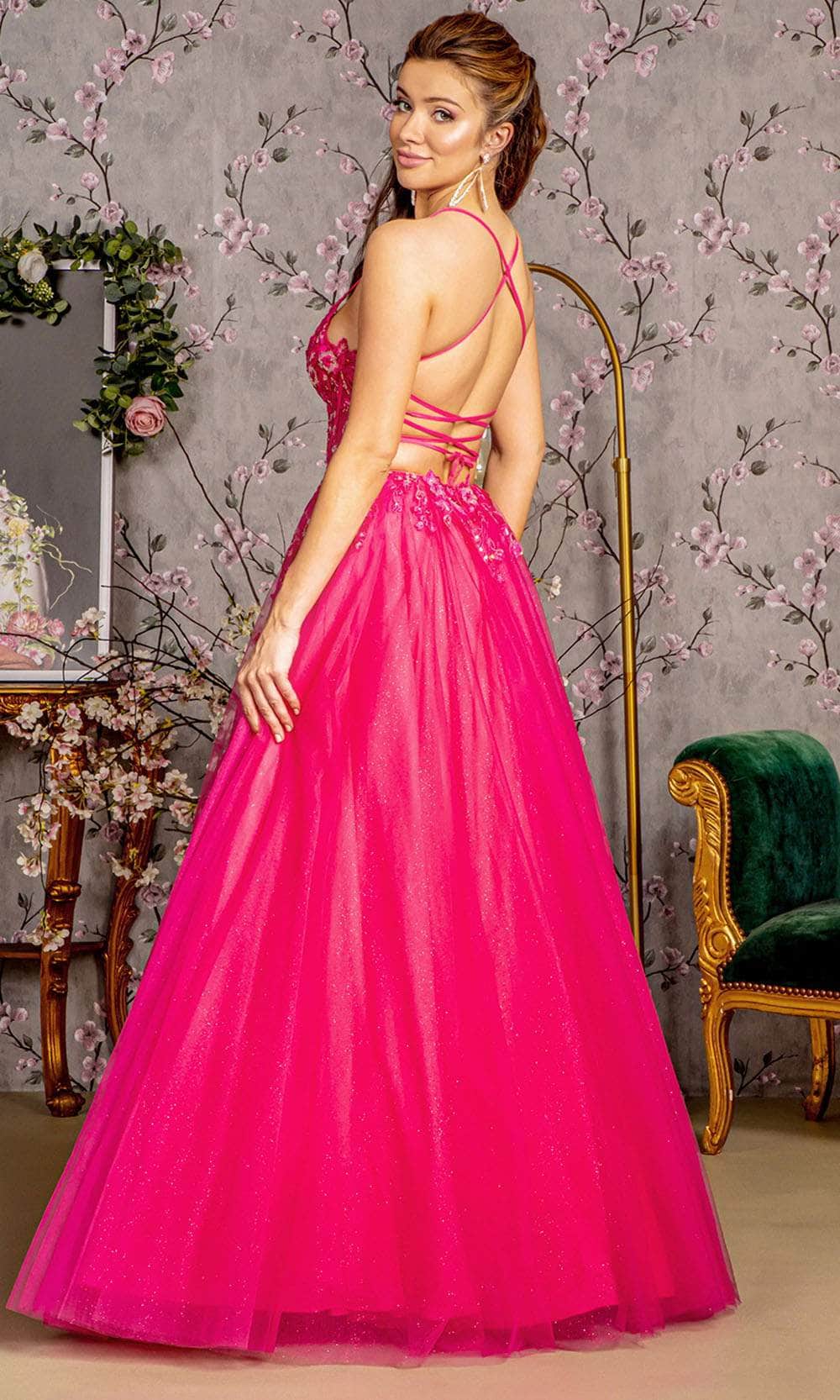 Radiate in GLS by Gloria GL3229, a stunning sequin and glitter embellished gown. The sheer corset bodice, adorned with sparkling sequins, features a flattering sweetheart neckline. Thin straps offer delicate support, leading to an open back with a lace-up tie and central zipper closure for a secure fit. The floor-length A-line skirt, crafted from ethereal mesh, flows gracefully, creating a captivating silhouette. This GLS by Gloria GL3229 seamlessly blends modern glamour with timeless elegance, making it a radiant choice for any special occasion. Model is wearing Hot Pink color.
