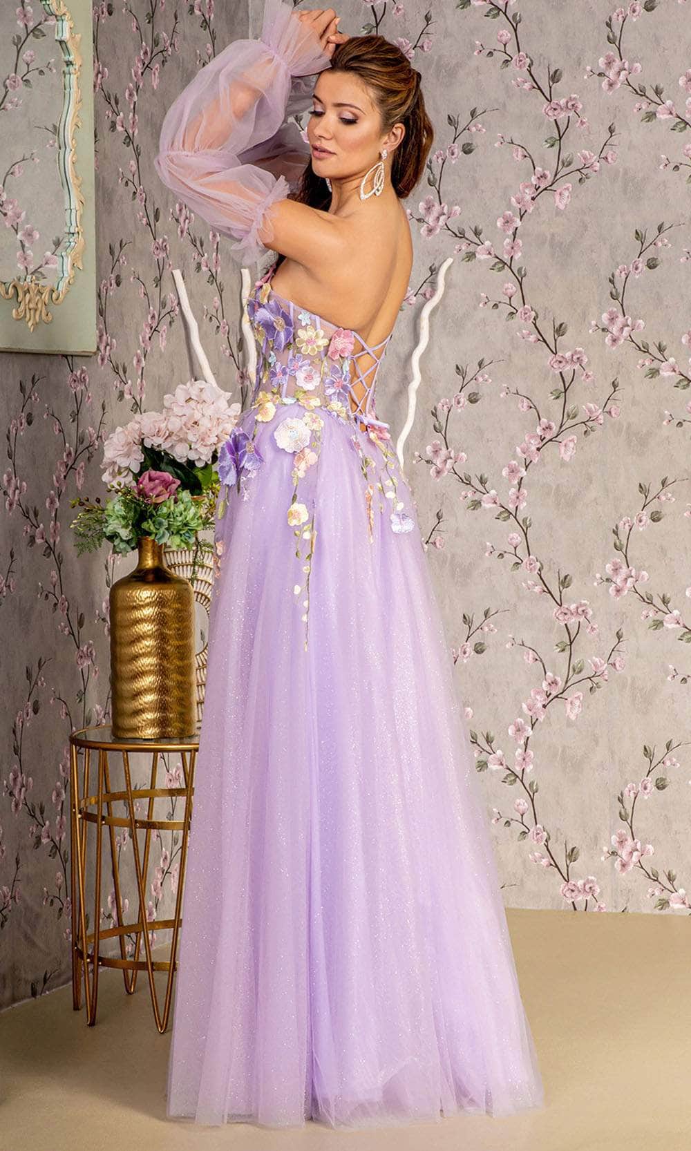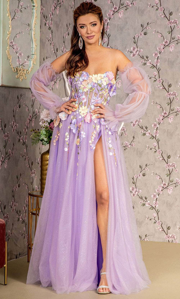 Step into a garden of elegance with GLS by Gloria GL3233, a mesmerizing 3-D flower glitter mesh A-line gown with long sleeves. The sweetheart neckline adds a touch of romance, while a lace-up tie and central zipper closure at the back ensures a secure fit. The floor-length A-line skirt, adorned with enchanting 3-D flowers and glittering mesh, gracefully parades in a captivating silhouette, accentuated by a subtle slit. This GLS by Gloria GL3233 combines modern allure with timeless charm, making it an exquisite choice for any special occasion. Model is wearing Lavender color.