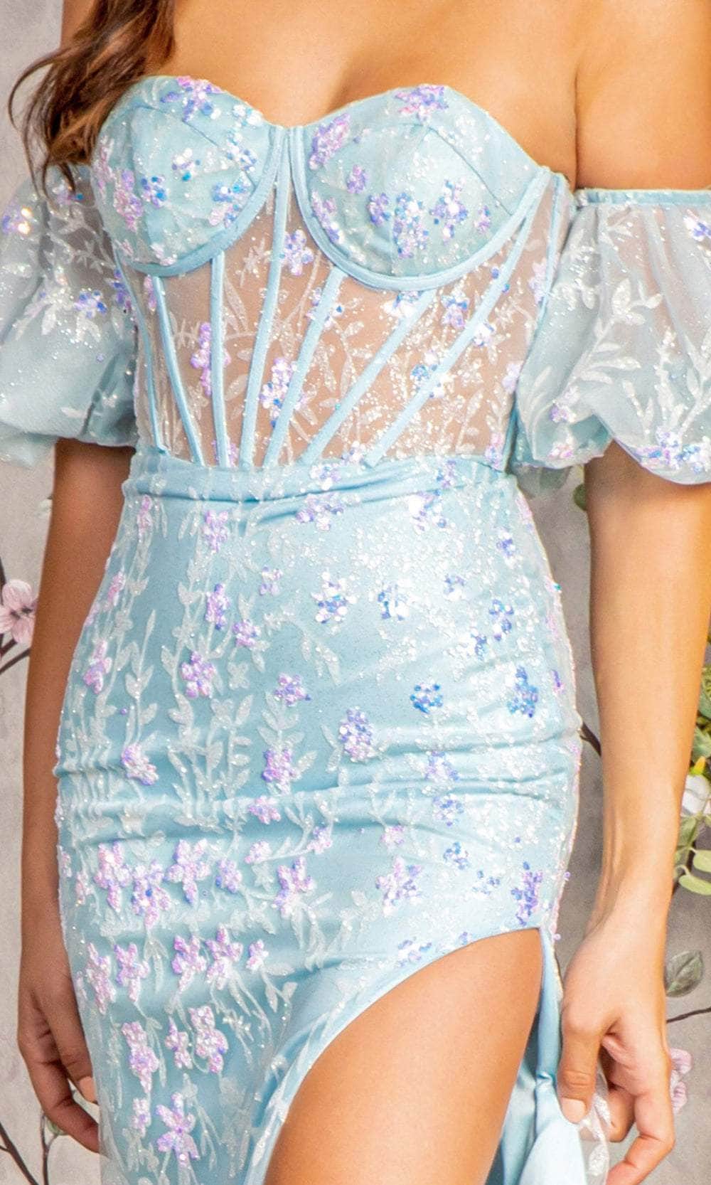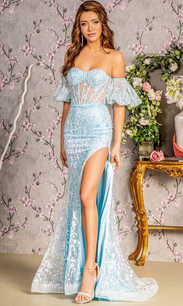 Capture all of their admiration in the breathtaking GLS by Gloria GL3247 evening gown. This stunning attire showcases an enchanting sweetheart neckline accompanied by charming detachable off-shoulder puff sleeves, all set on a well-fitted corset bodice. The mid-open back is elegantly fastened with a zipper for a polished look. Adding to its allure is a high slit in the floor-length mermaid skirt, complemented by a sweeping train for an extra touch of glamour. The entire gown is adorned with sequin embellishments and glimmers, ensuring you steal the spotlight throughout the night. Embrace fabulousness in this exquisite GLS by Gloria GL3247 masterpiece. Model is wearing Baby Blue color.