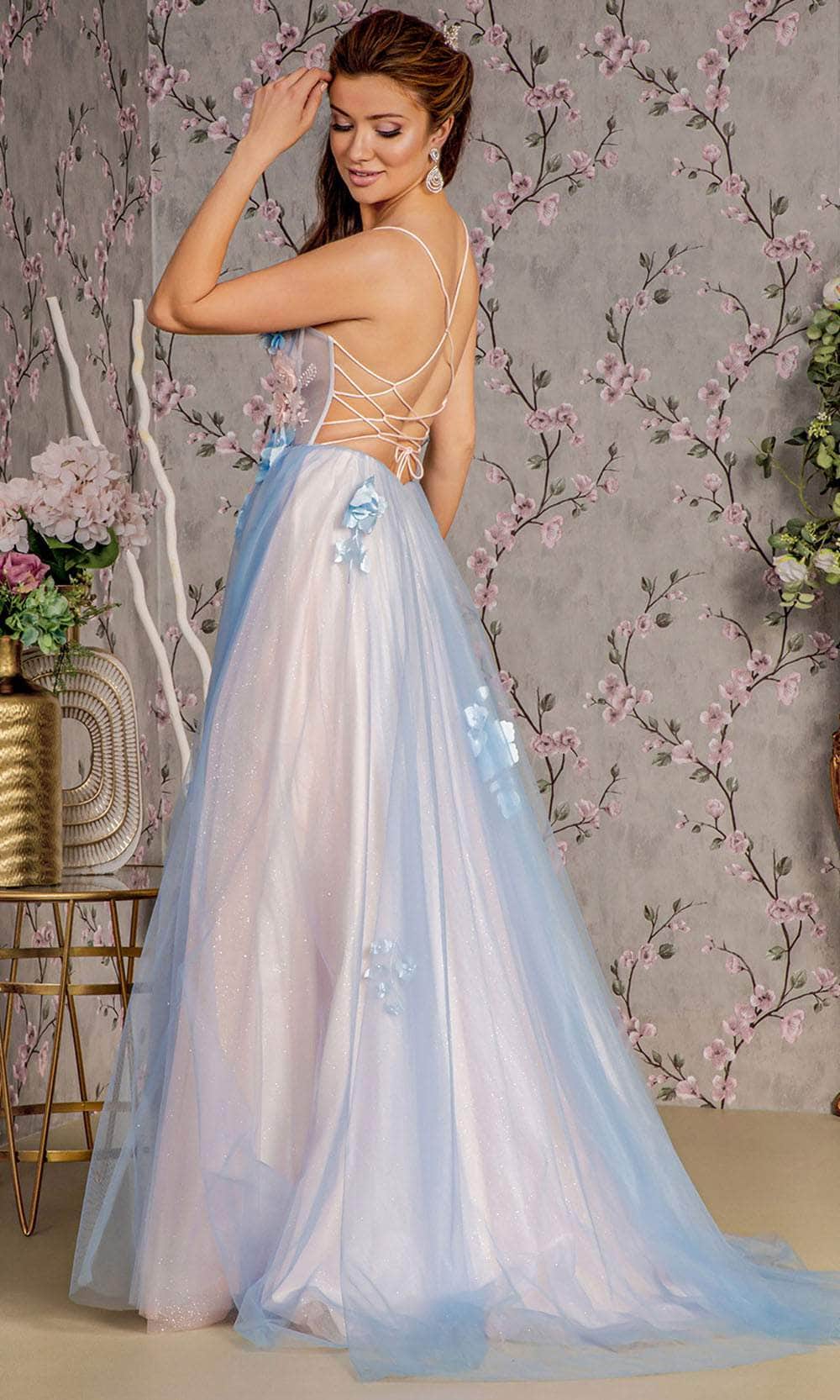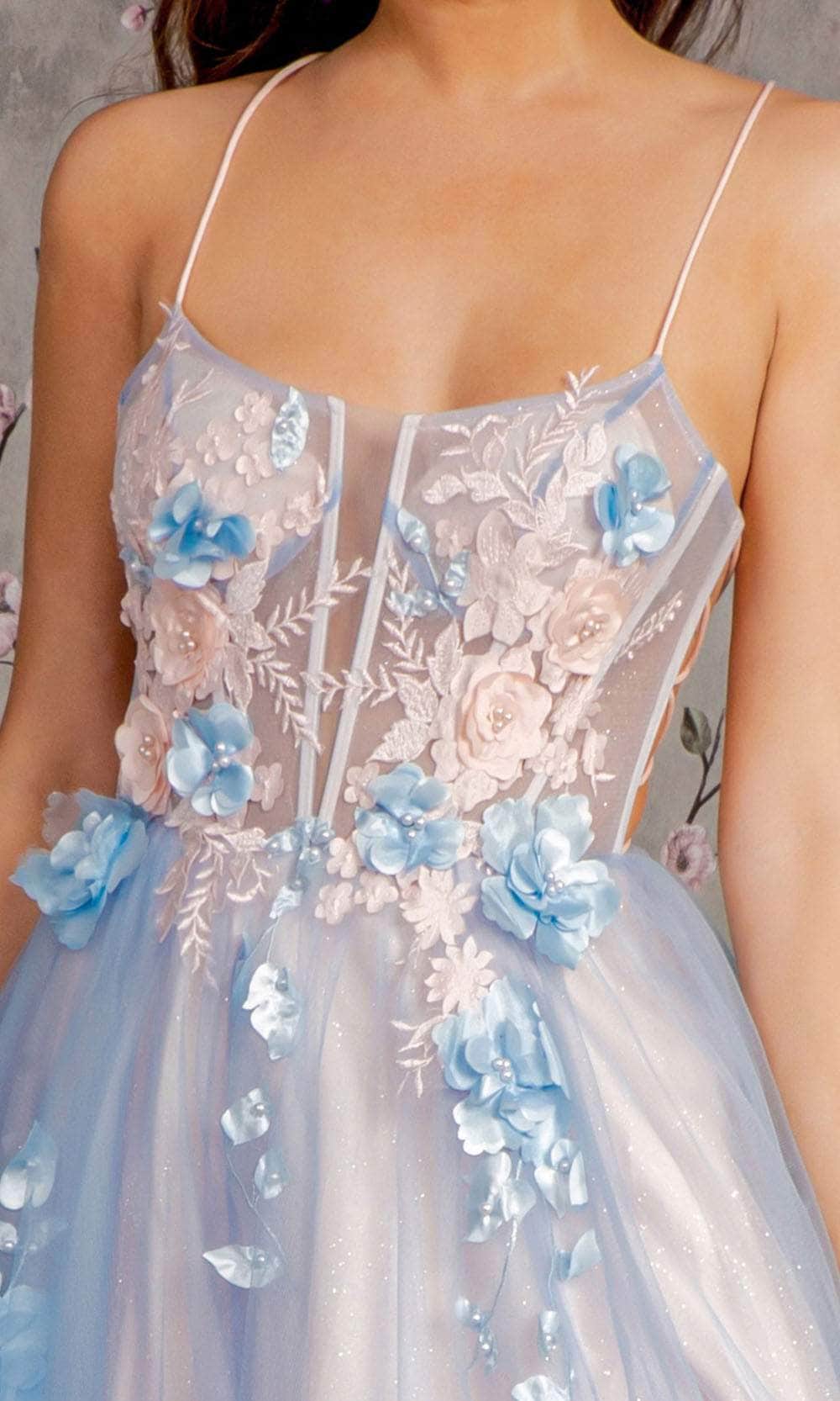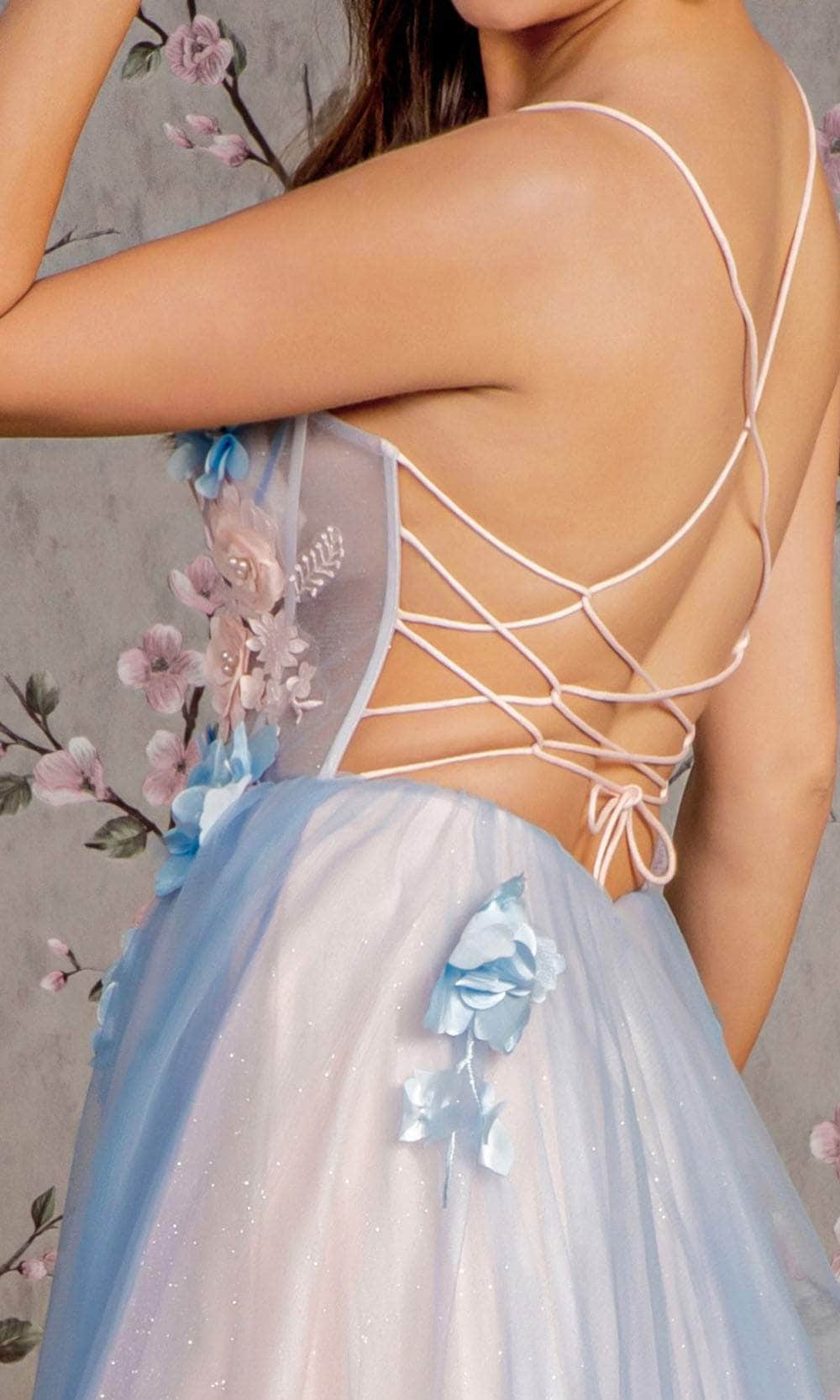 GLS by Gloria GL3250 is a captivating A-line gown with a sheer bodice adorned with three-dimensional flowers that exude sophistication and eroticism. A hint of refinement is added by the sleeveless style and scoop neck, and a seductive appeal is created by the cut-out back. With a slit highlighting the length of the skirt, it parades beautifully and ends in a gorgeous train. The lace-up back fastening guarantees a secure fit. Gloria GL3250 GLS is a stunning option for any special occasion since it expertly combines classic charm and modern elegance. Model is wearing Blue/Peach color.