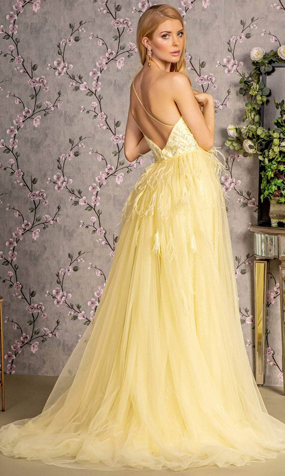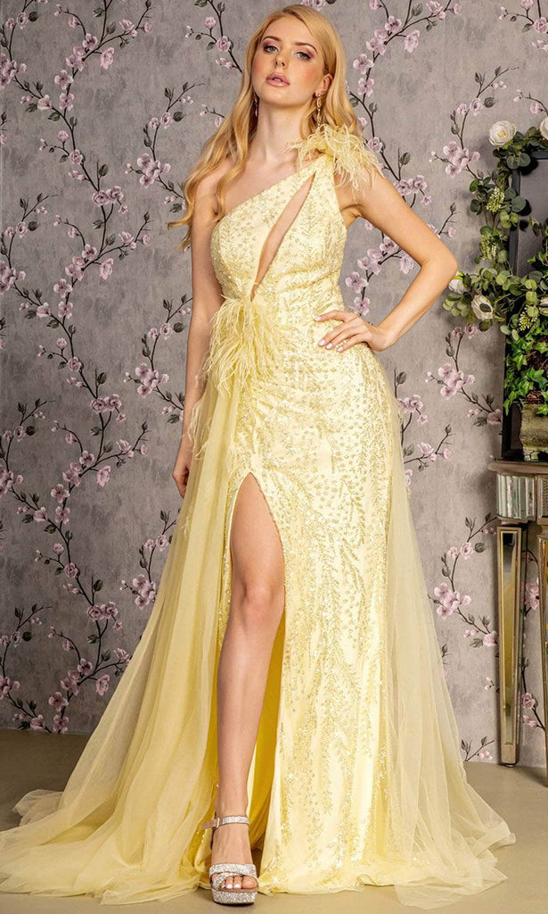 Step into the spotlight with GLS by Gloria GL3278, an alluring asymmetric gown tailored from luxurious mesh fabric. The one-shoulder bodice is adorned with sparkling beads and feathers, featuring an asymmetrical cut-out in front. An asymmetrical spaghetti strap at the open back, along with a central zipper closure, ensures a secure fit. The floor-length sheath silhouette showcases a detachable waist drape, complemented by a slit, gracefully concluding with a train. GLS by Gloria GL3278 seamlessly combines modern allure with timeless sophistication, creating a captivating presence. Model is wearing Light Yellow color.