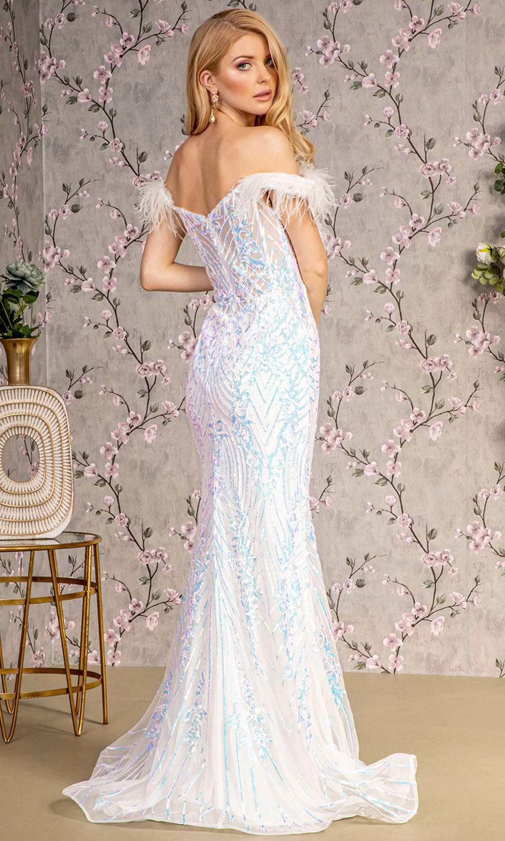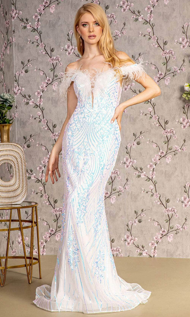 Shine from the inside out in this GLS by Gloria GL3284, a breathtaking sequin-embellished gown meticulously tailored from luxurious mesh fabric. The off-shoulder bodice, adorned with feather details, captivates with sparkling sequins. A secure fit is ensured by the central zipper closure at the back. The floor-length mermaid silhouette gracefully parades, concluding with a train finish. This gown seamlessly combines modern glamour with timeless sophistication, making GLS by Gloria GL3284 a radiant choice for any special occasion where opulence meets elegance. Model is wearing Ivory color.