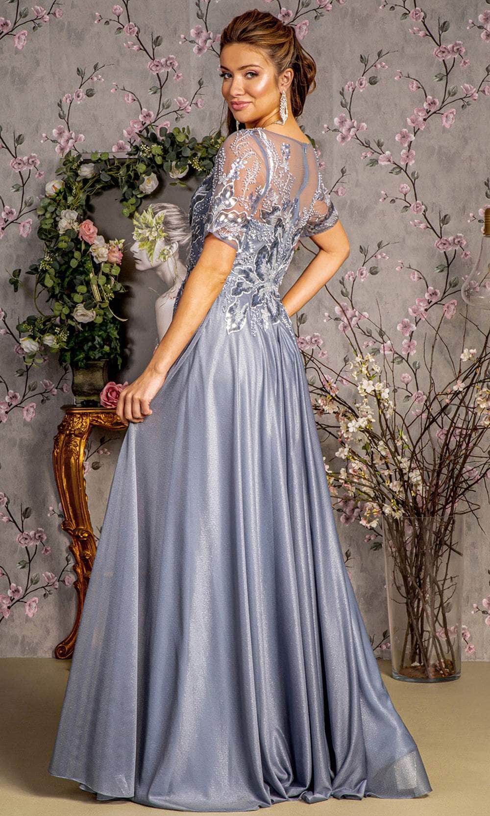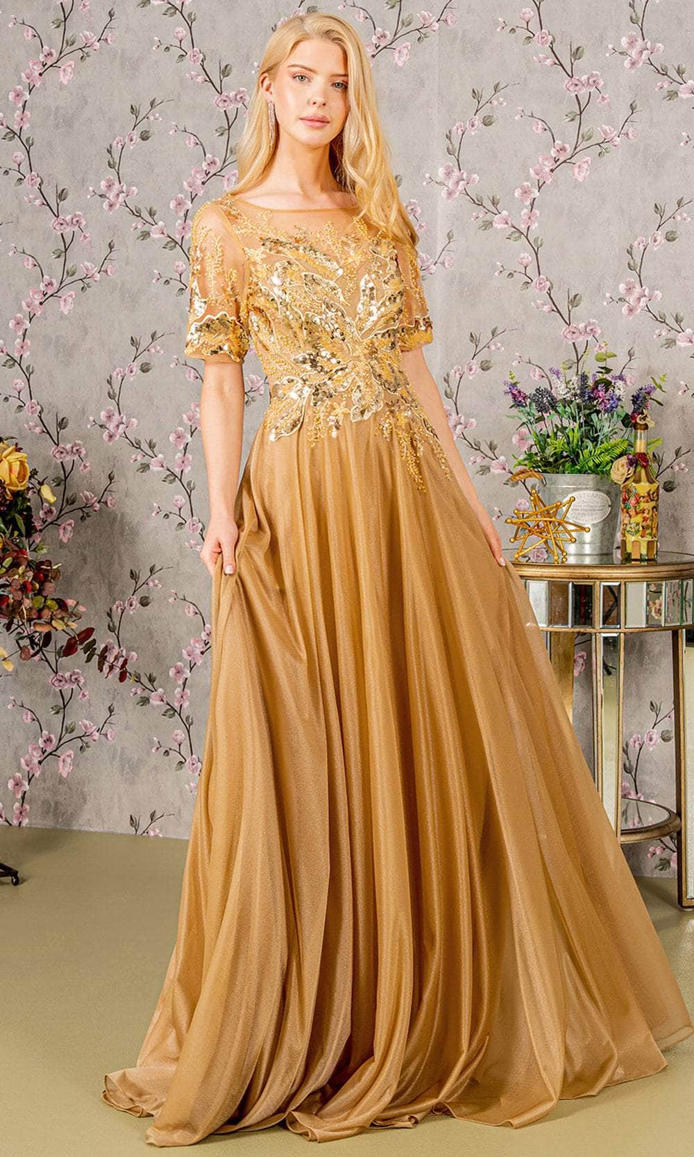 Shine in the GLS by Gloria GL3444 evening gown, boasting an illusion bateau neckline and a full illusion back with a sleek zipper closure. The bodice sparkles with sequin and bead embellishments, complemented by short sleeves. The flowing A-line skirt adds grace, making this gown a perfect blend of glamour and sophistication. Available in Gold and Silver.
