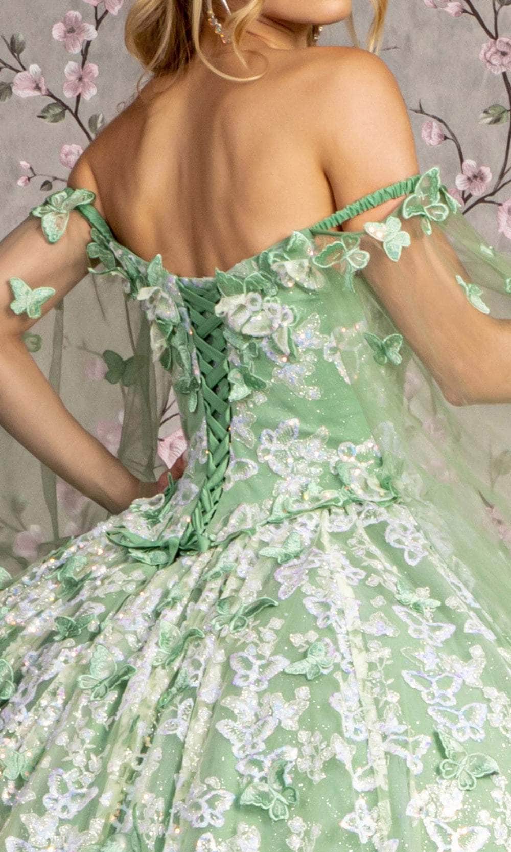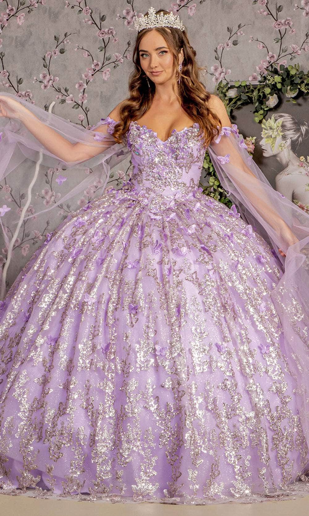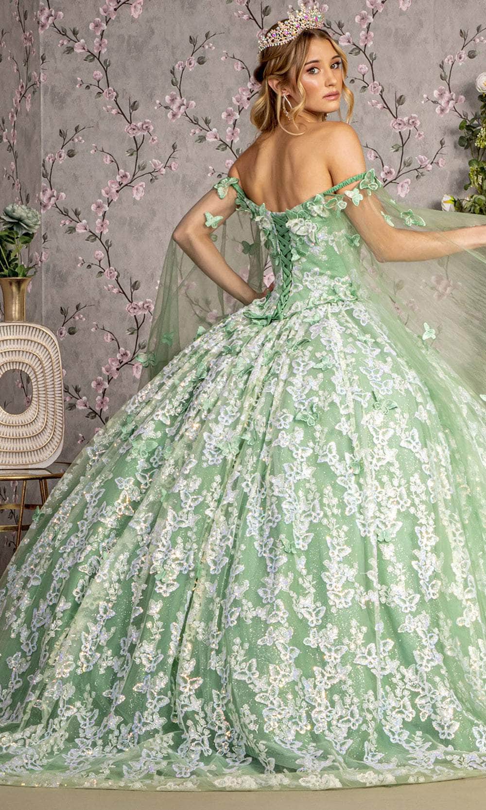 Radiate with pristine elegance in the stunning GLS by Gloria GL3451 ball gown. This dress features a charming off-shoulder neckline, complemented by fabulous long cape sleeves. The mid-open back is elegantly secured with lace for a graceful finish. The gown is adorned with a combination of butterfly appliques, sequins, and glitters, ensuring you look absolutely captivating. A basque waistline adds to the overall sophistication. This GLS by Gloria GL3451 gown is crafted to make your special occasion truly unforgettable. Models are wearing Lilac, Mauve, and Sage colors.