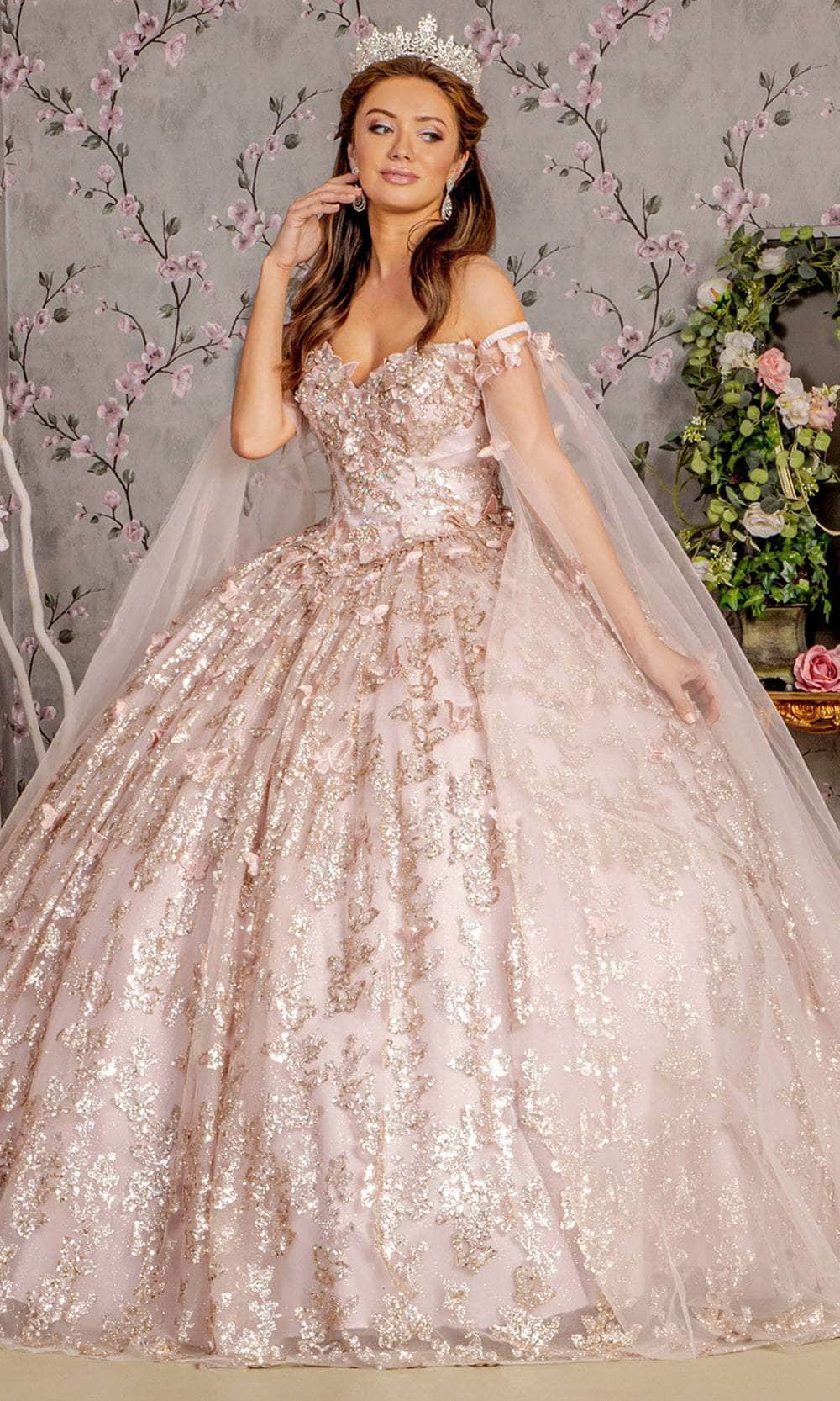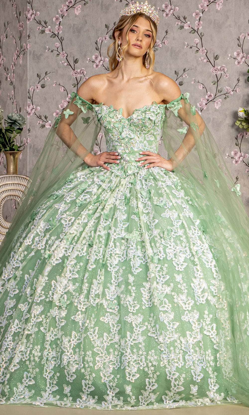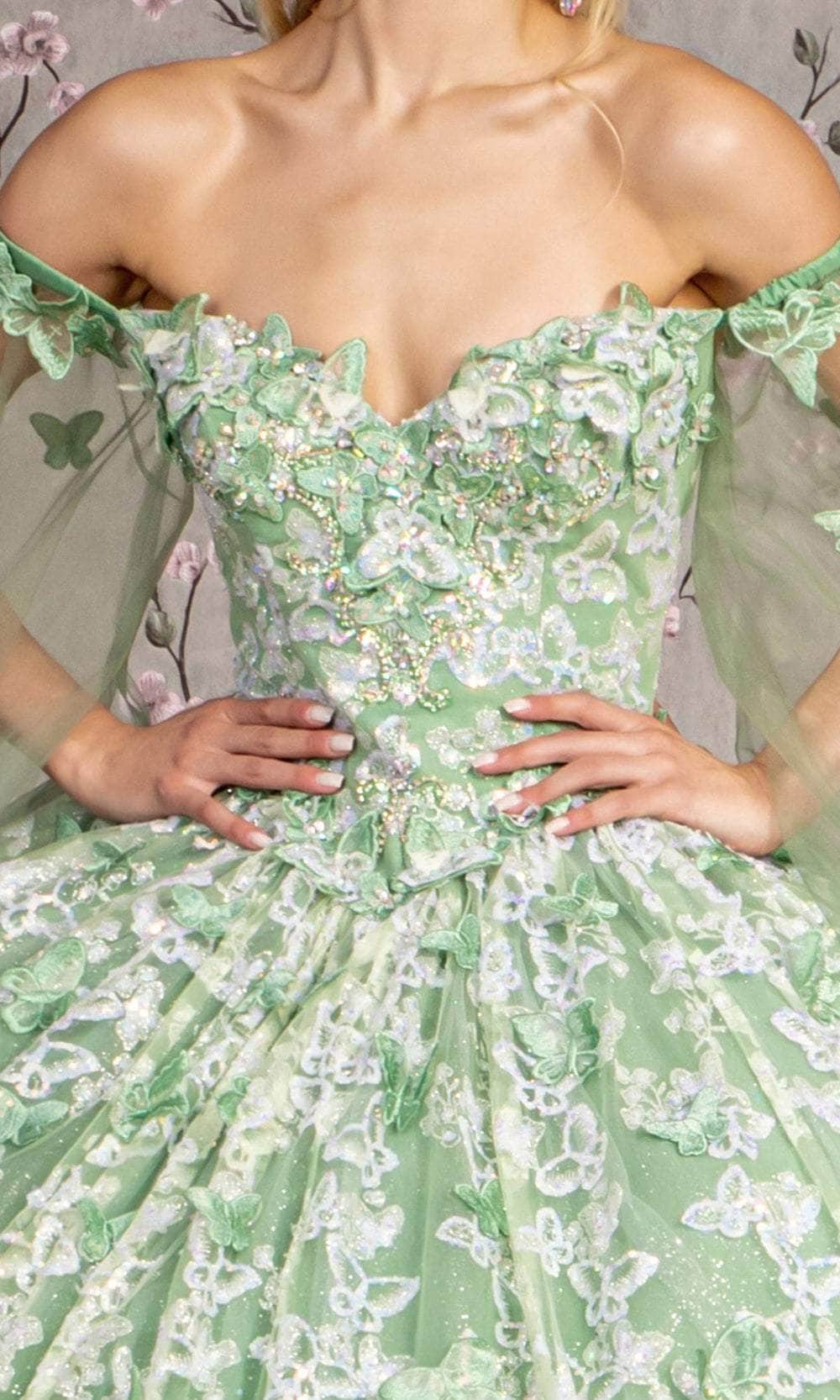 Radiate with pristine elegance in the stunning GLS by Gloria GL3451 ball gown. This dress features a charming off-shoulder neckline, complemented by fabulous long cape sleeves. The mid-open back is elegantly secured with lace for a graceful finish. The gown is adorned with a combination of butterfly appliques, sequins, and glitters, ensuring you look absolutely captivating. A basque waistline adds to the overall sophistication. This GLS by Gloria GL3451 gown is crafted to make your special occasion truly unforgettable. Models are wearing Lilac, Mauve, and Sage colors.