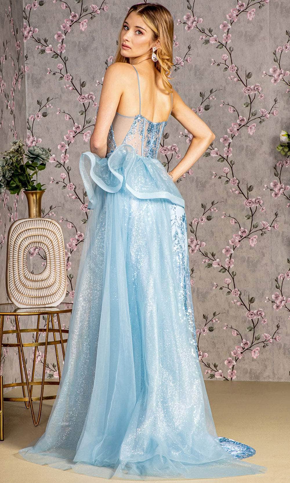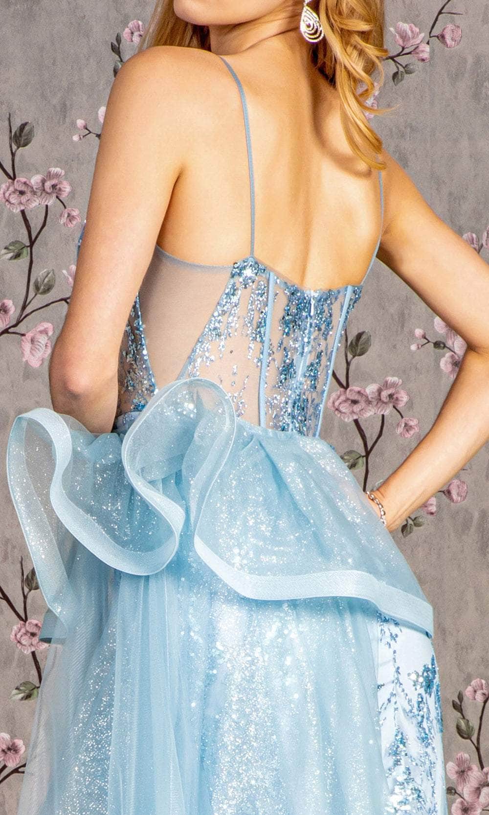 Leave an indelible mark with the GLS by Gloria GL3459 evening dress, ensuring a memorable grand entrance. This dress showcases a delightful sweetheart neckline on a fitted and sleeveless bodice, complete with spaghetti straps and intricate boning details. The mid-open back is elegantly secured by a zipper, ensuring a refined finish. Adding to its allure, a high slit graces the floor-length sheath skirt, enhanced with a fabulous sweep train and a stylish ruffle design on the hip. Entirely adorned with sequins and glitters, this creation lets you dominate the spotlight with your radiant sparkle. Sway to the music on your special night in this harmonious evening ensemble by the masterful GLS by Gloria GL3459. Models are wearing Fuchsia, and Smoky Blue colors.