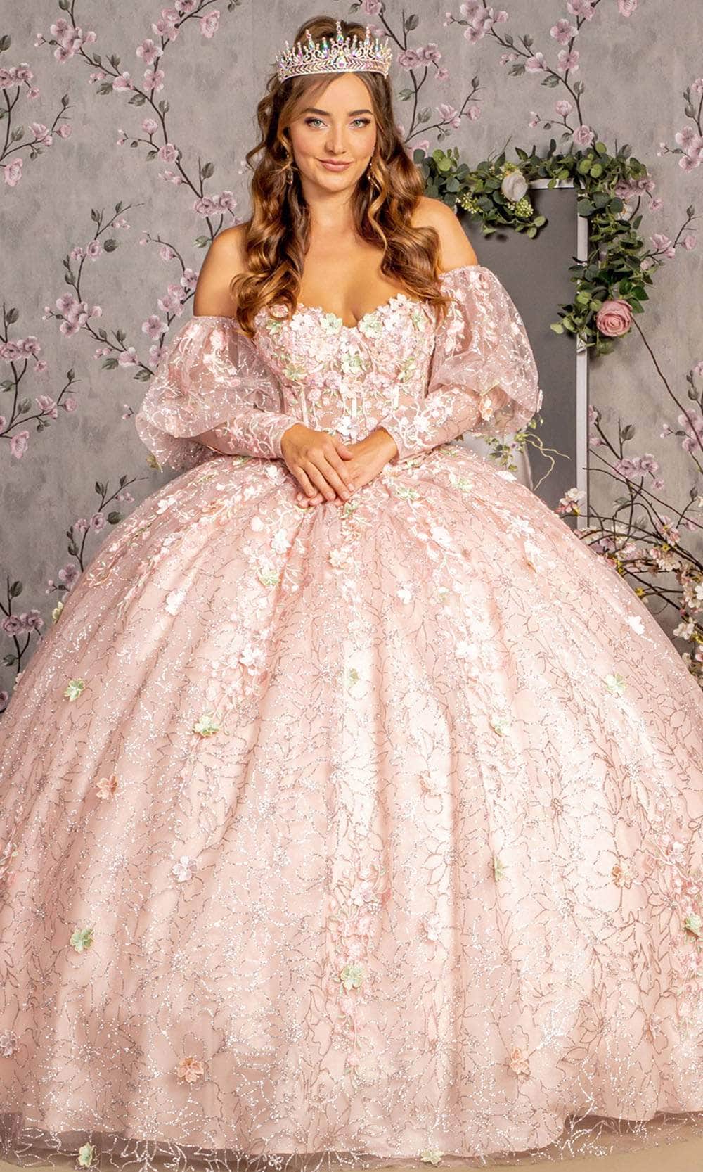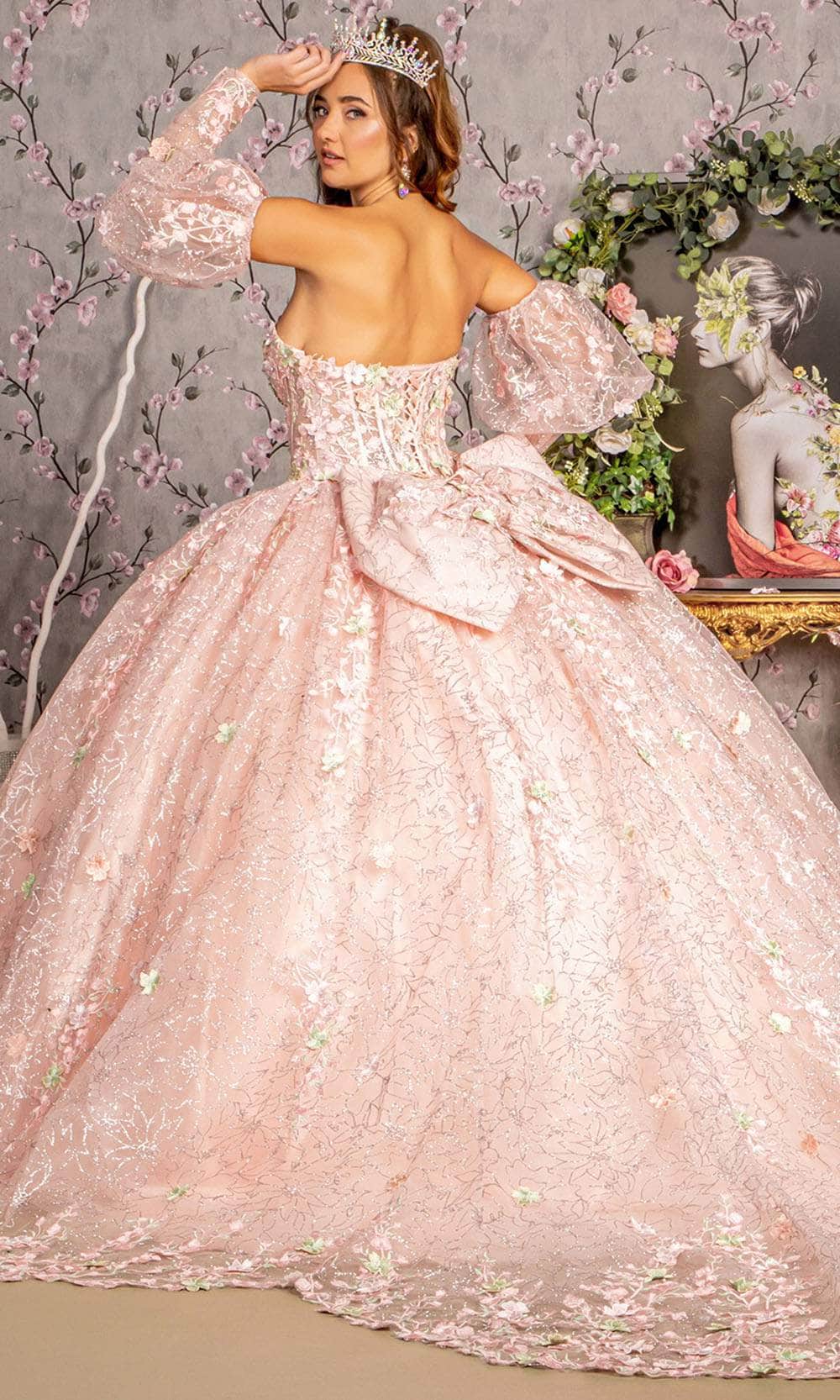 Step into luxury with GLS by Gloria GL3466, an enchanting ballgown that exudes sophistication. The sheer corset bodice, paired with a sweetheart neckline and long puff sleeves, creates a captivating silhouette. Intricate appliques, beads, glitters, jewels, and sequins adorn the ensemble, radiating opulence. A detachable big bow adds a touch of drama to the back, while a lace-up tie ensures a secure fit. The floor-length skirt gracefully parades, culminating in a majestic train finish. GLS by Gloria GL3466 seamlessly fuses modern allure with timeless elegance, making it a captivating choice for grand occasions. Model is wearing Blush color.