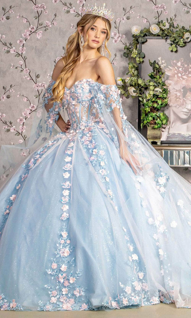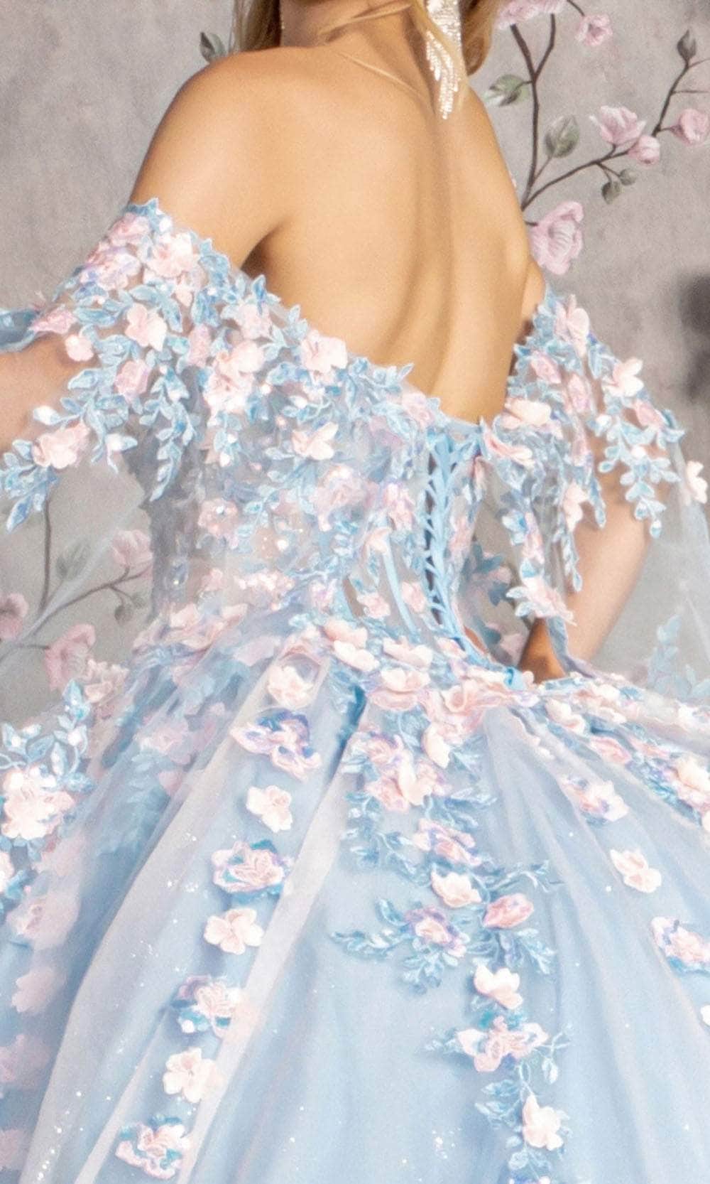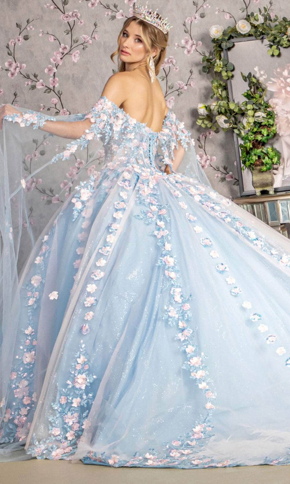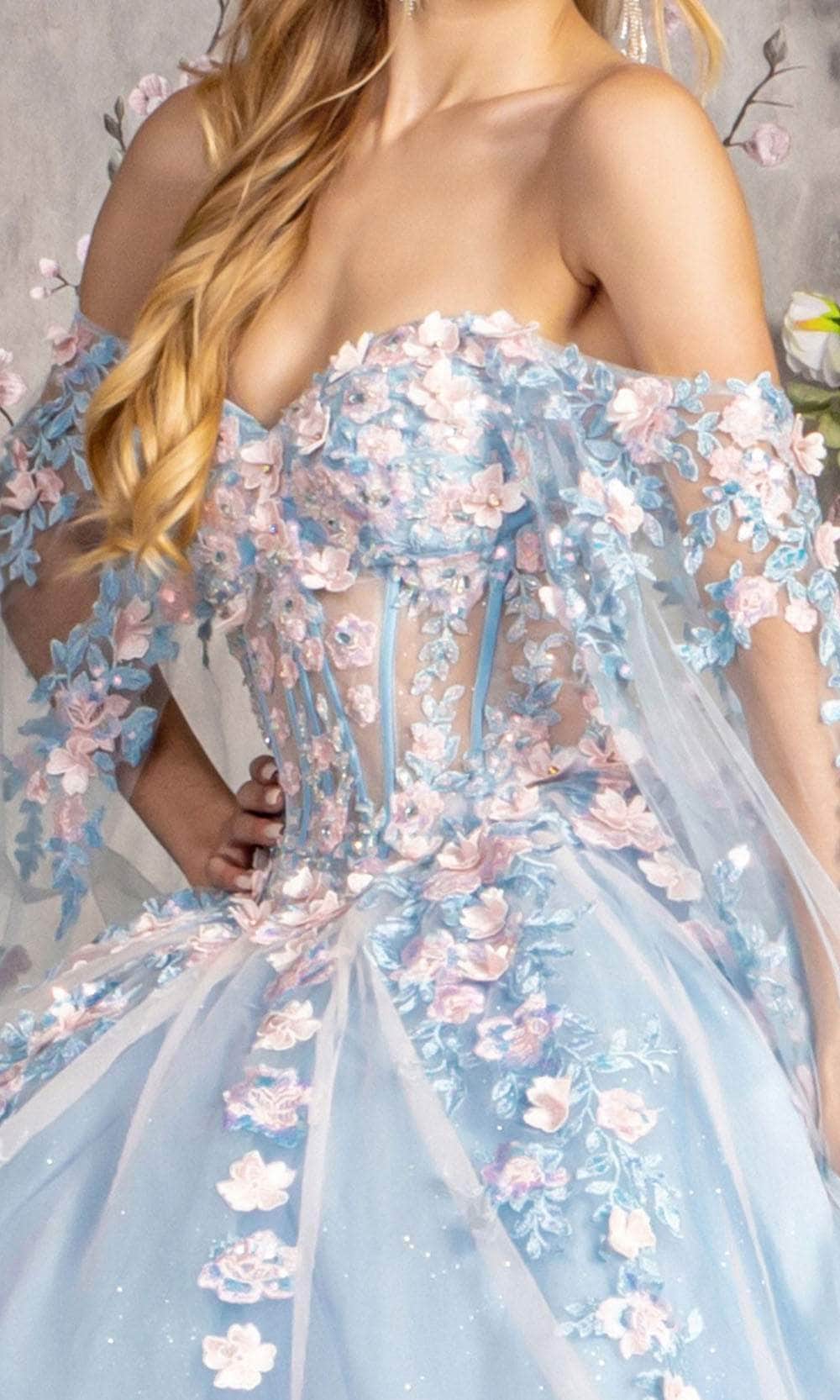 Be ready to fascinate everyone in this GLS by Gloria GL3468, a captivating ballgown featuring an off-shoulder sheer corset bodice with a sweetheart neckline and side mesh long drapes. Adorned with enchanting 3D floral embellishments, appliques, beads, embroideries, glitters, jewels, and sequins, this ensemble creates a stunning effect. A lace-up tie ensures a secure fit, while the floor-length skirt gracefully parades, concluding with a dramatic long train finish. GLS by Gloria GL3468 seamlessly fuses modern allure with timeless sophistication, making it a radiant choice for grand occasions. Model is wearing Baby Blue color.
