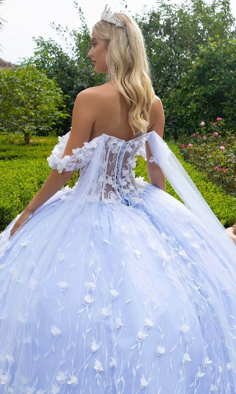 Radiate princess-like charm and chic in this GLS by Gloria GL3571 masterpiece. The see-through corset bodice with boning features makes this gown truly breathtaking. Multidimensional flower appliques paired with sequins and glitter in the form of vine-like patterns decorate the all-over length. The beaded brooch at the center bust, off-shoulder cap sleeves, and a sweetheart neckline frame your decolletage with romantic allure. At the back, it shows a glance of your skin with the mid-open cut and it has an adjustable lace-up closure for a cozy fit. The skirt wonderfully forms a voluminous ballgown silhouette that streams to the sweep train, while the addition of the Watteau train that flows from the back leaves a long-lasting impression. The GLS by Gloria GL3571 creation is definitely an attention-grabber for quinceanera. Model is wearing Ivory/Blue color.