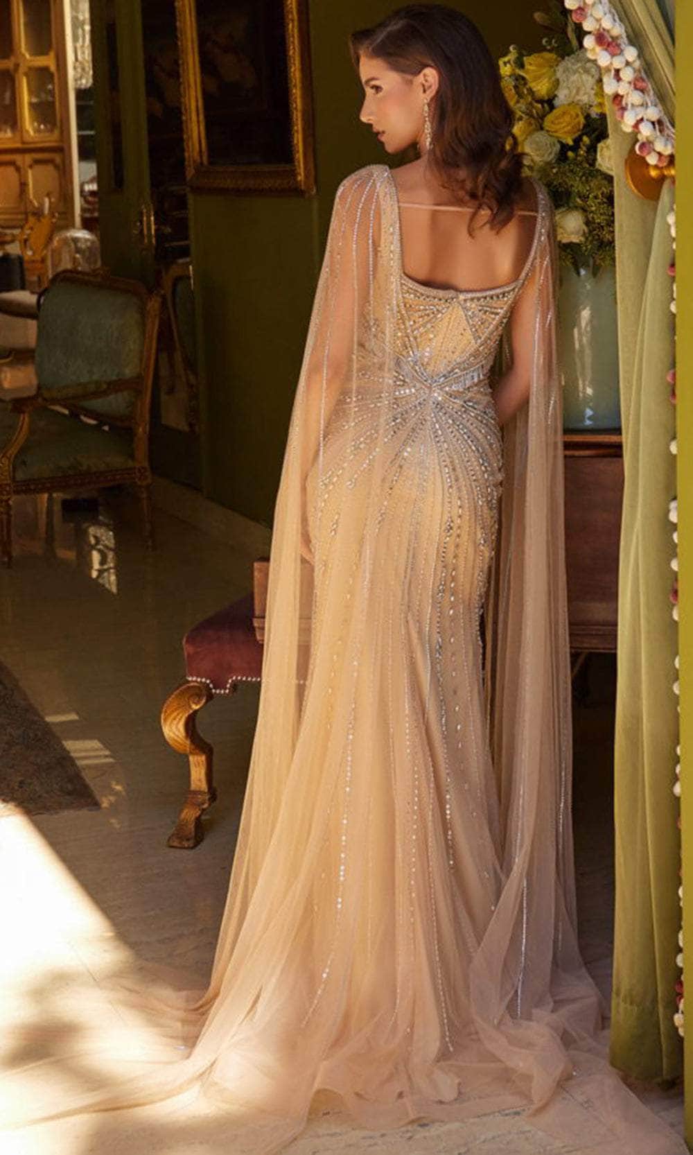 Prepare to captivate in the GLS by Gloria GL3583 dress, a magnificent creation designed for those who seek elegance and sophistication. An enchanting floor-length gown that exudes grace and sophistication. This stunning dress is tailored from mesh fabric and features an embellished cape sleeve design, adding a touch of elegance to your look. The illusion waist cutout is adorned with beaded fringe accents, creating a unique and captivating effect. The floor-length skirt flows gracefully, ending beautifully with a horsehair hem and train, ensuring you make a dramatic entrance. Capture the spotlight with the GLS by Gloria GL3583 dress. Model is wearing Gold color.