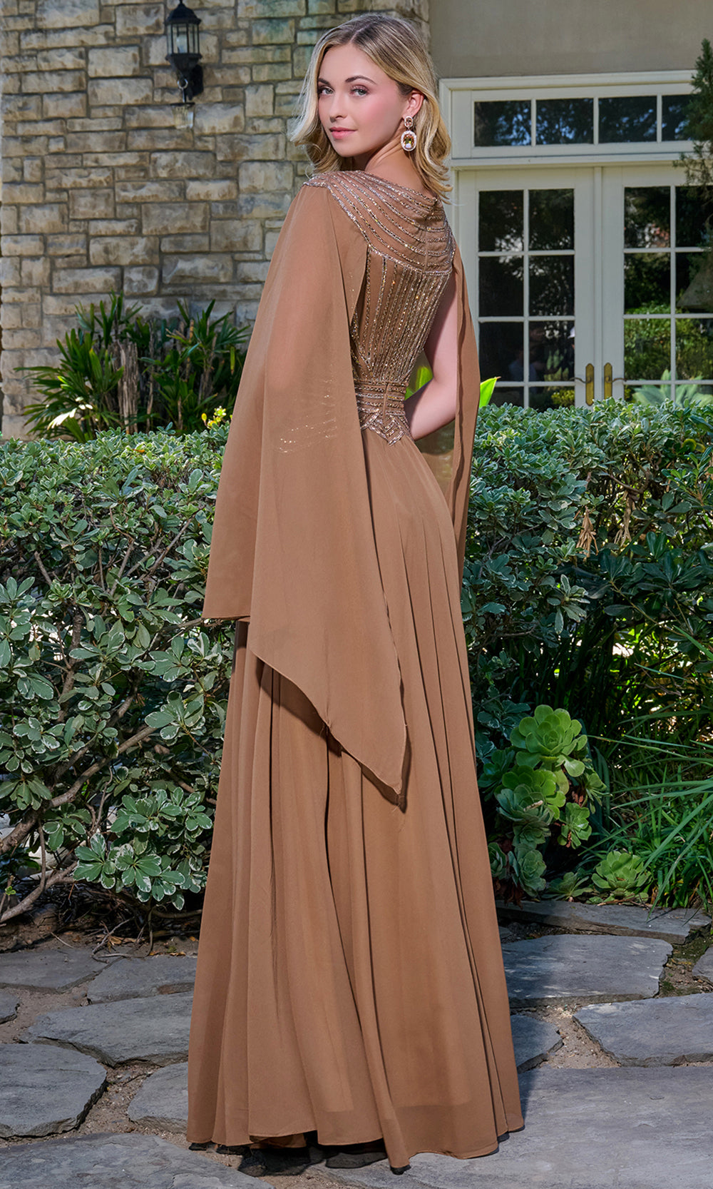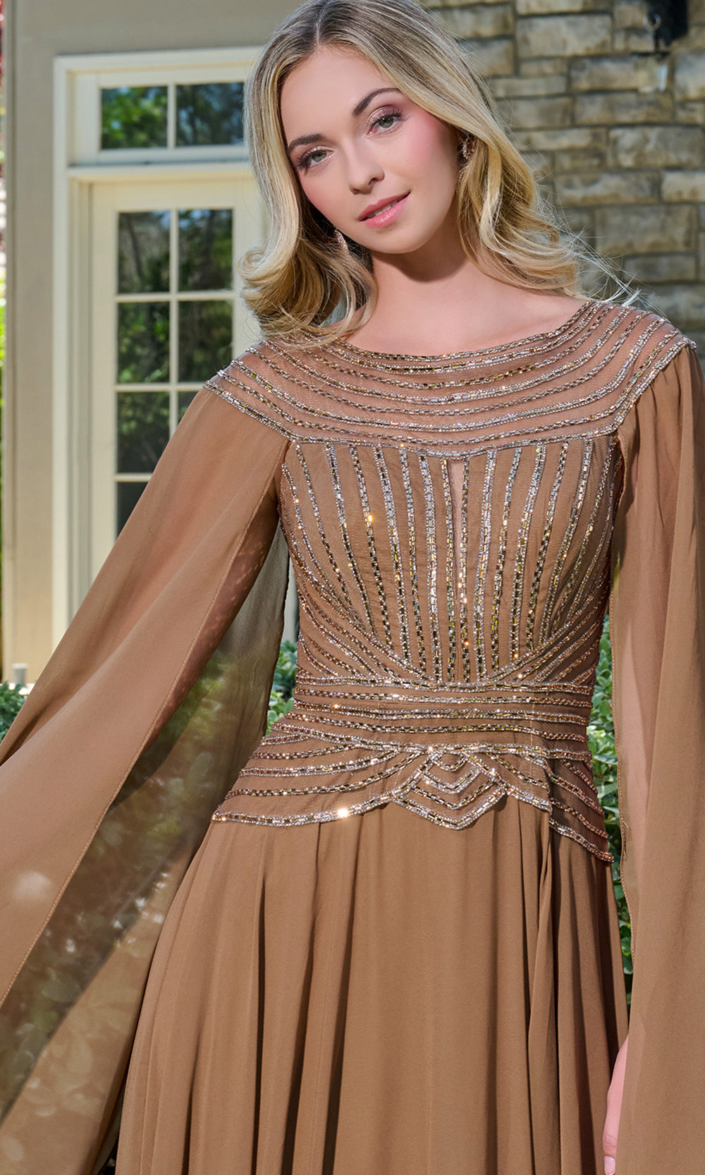 Evening entrances feel effortless in GLS by Gloria GL3736, a gown that balances graceful coverage with standout sparkle. Beaded lines sweep across the bodice and continue through the shoulder area for a luminous frame near the face. Cape sleeves fall in airy panels, adding movement with each step while keeping the arms softly covered. A defined waistband shapes the figure before the A-line skirt releases into flowing pleats that glide across the floor. Designed for formal celebrations and evening events, this GLS by Gloria GL3736 balances grace and confidence effortlessly. Models are wearing Chocolate Brown, and Smoky Blue colors.