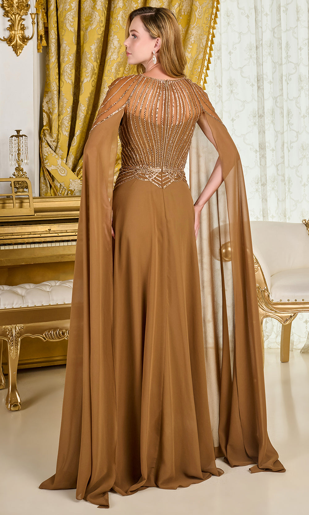 With the GLS by Gloria GL3785 gown, experience a design that radiates poise and refined style. The ensemble features an intricately beaded bodice that catches the light in elegant lines, leading into a flowing A-line skirt that moves with effortless grace. Dramatic cape sleeves drape softly from the shoulders, creating a regal aura while maintaining a soft, feminine charm. The scoop neckline offers balance to the embellished details, perfect for formal evenings and milestone celebrations. Make GLS by Gloria GL3785 your choice for a moment that demands presence and sophistication. Model is wearing L/Brown color.