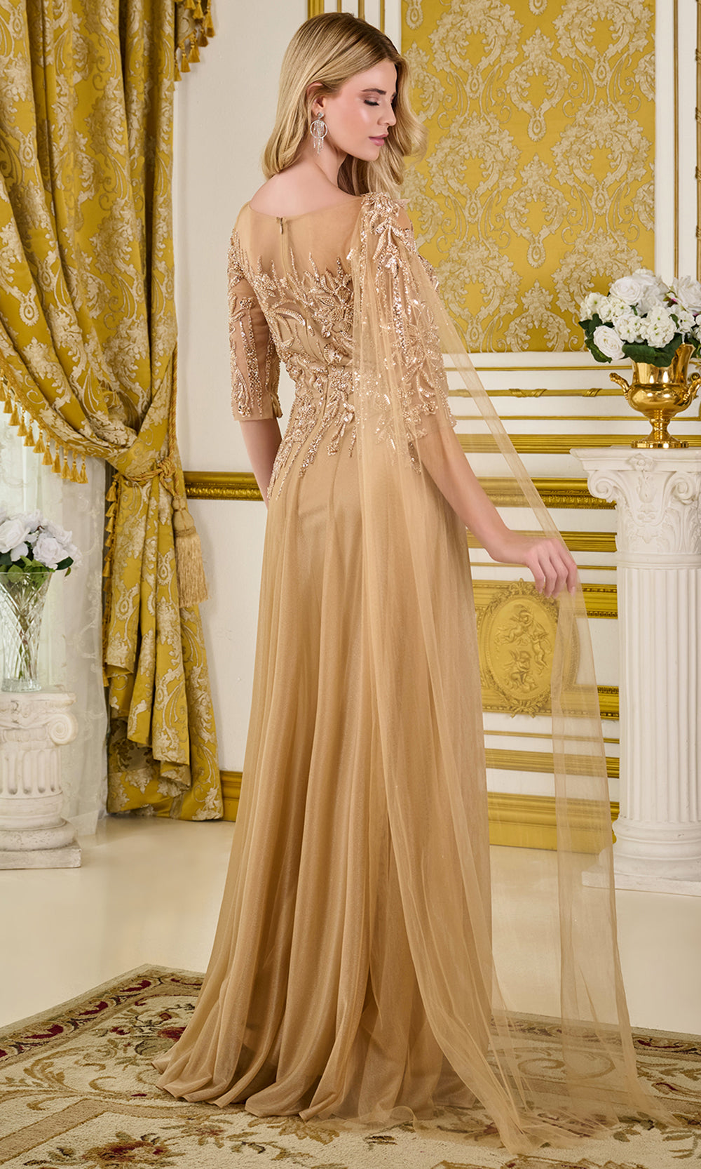 The GLS by Gloria GL3788 gown captures refined sophistication with its detailed beadwork and graceful silhouette. Featuring a bateau neckline and three-quarter sleeves, the bodice is adorned with elaborate embellishments that enhance the sculpted form and create a luxurious textural appeal. A dramatic illusion cape cascades from one shoulder, adding an elevated sense of movement that complements the softly flowing skirt. From bodice to hem, this A-line design balances artistry and wearable elegance. Perfect for memorable formal occasions, GLS by Gloria GL3788 brings a sense of memorable refinement to your ensemble. Model is wearing Champagne color.