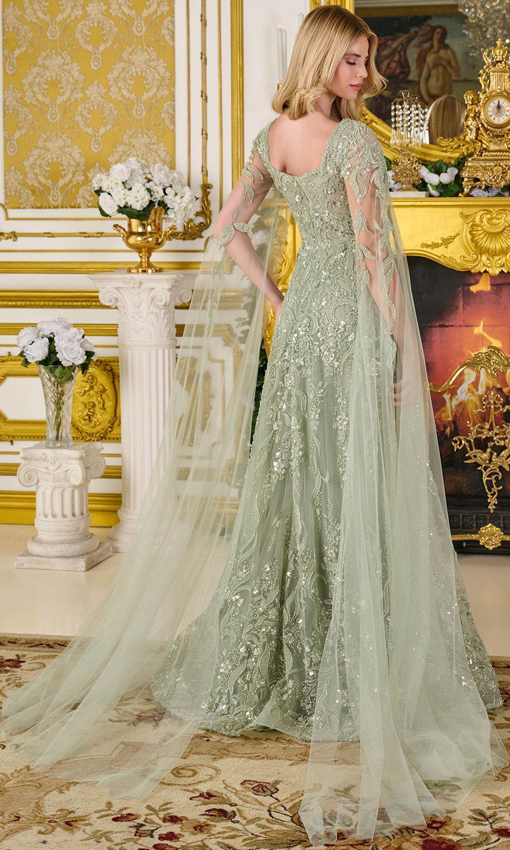 | Details: | Cape Sleeves, 3D Floral Appliques, Beaded, Sequins, Embroidery, Scoop Back, Sweep Train |