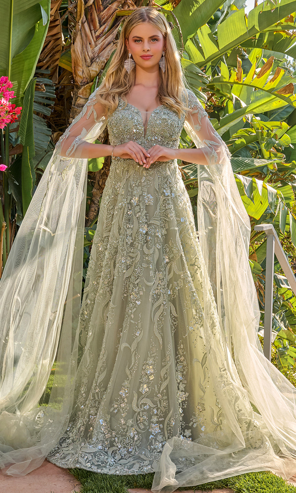 Created to elevate your presence with radiant allure, GLS by Gloria GL3838 captures the eye with luminous texture and flowing cape. The A-line silhouette flatters through its balanced lines and gentle sweep, offering an inspiring blend of classic refinement and contemporary flair. Embellished accents shimmer throughout the design, creating a sense of depth and movement that feels both luxurious and expressive. Securely finished with a back zipper and plunging v-neckline, this gown harmonizes polished structure with memorable style. Perfect for distinguished formal celebrations, GLS by Gloria GL3838 delivers an unforgettable statement of elegance and poise. Model is wearing Sage color.
