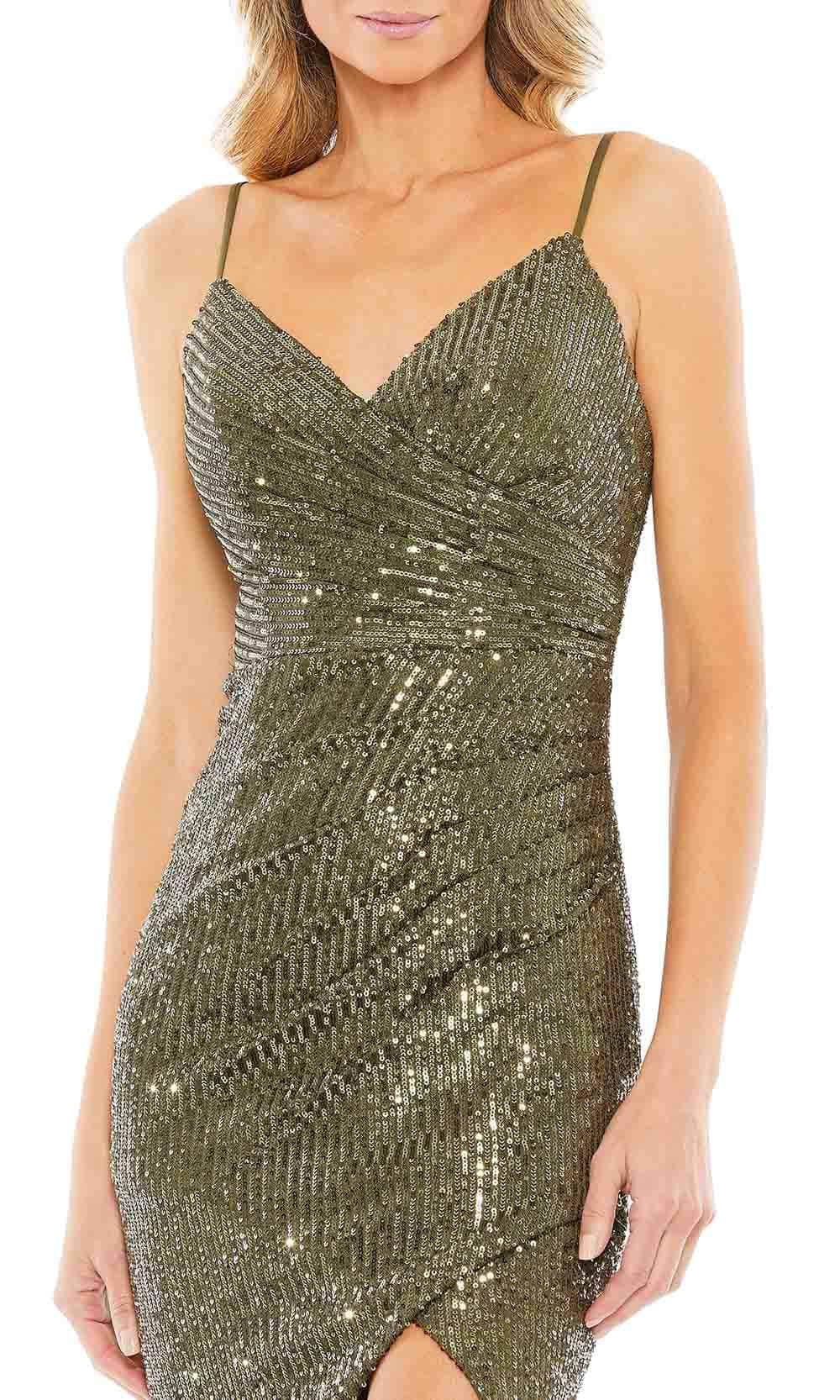 Elevate your style with Mac Duggal 11272. This stunning dress features ruching detail along the bodice and skirt, creating a flattering and feminine silhouette. The spaghetti straps add a delicate touch, while the V-neckline beautifully frames the neckline. Finished by the asymmetric hemline that adds a modern and unique twist to the design and the mid V-back adds a touch of allure, while the back zipper ensures a secure and comfortable fit. Be fabulous in this Mac Duggal creation! Model is wearing Olive color.