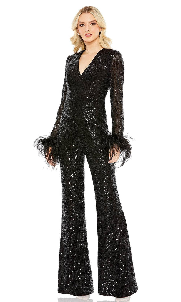 Walk in glamour in this Mac Duggal 11581, a captivating jumpsuit crafted from sequin-embellished mesh fabric. The long sleeves, adorned with feathers at the cuff, add a touch of glamour to the ensemble. A V-neckline complements the chic design, while a central zipper at the back ensures a seamless fit. The floor-length straight wide-leg pants complete this stylish jumpsuit. Mac Duggal 11581 is a statement piece for those seeking a perfect blend of sparkle and sophistication at any special event. Model is wearing Black color.