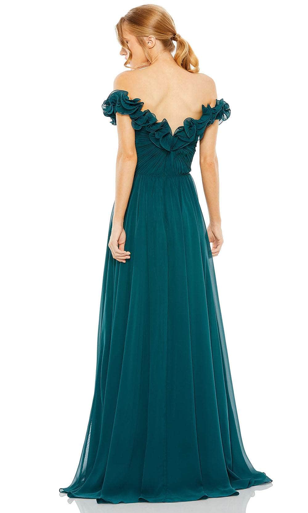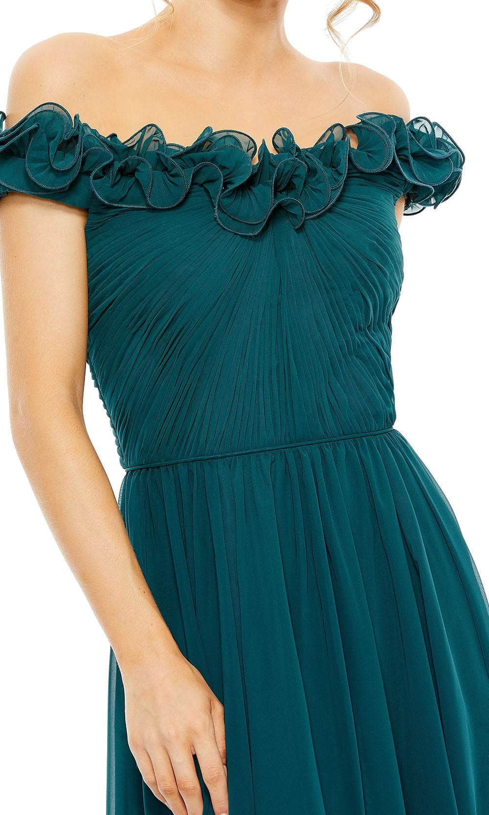 Be the showstopper at any special event in this Ieena Duggal 11591 creation. Crafted from luxurious tulle fabric, this gown features cap sleeves and a remarkable off-shoulder neckline adorned with unique ruffles. It also highlights the ruched detailing on the bodice, and a v-shaped open back with zipper closure. The A-line skirt drapes beautifully to the floor length hem and mini train, completed with a thigh-high slit for graceful movement. This Ieena Duggal 11591 style is sure to be both comfy and fashionable. Model is wearing Teal color.