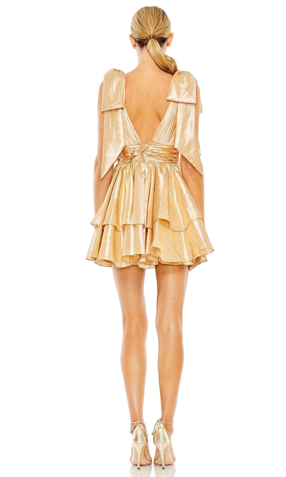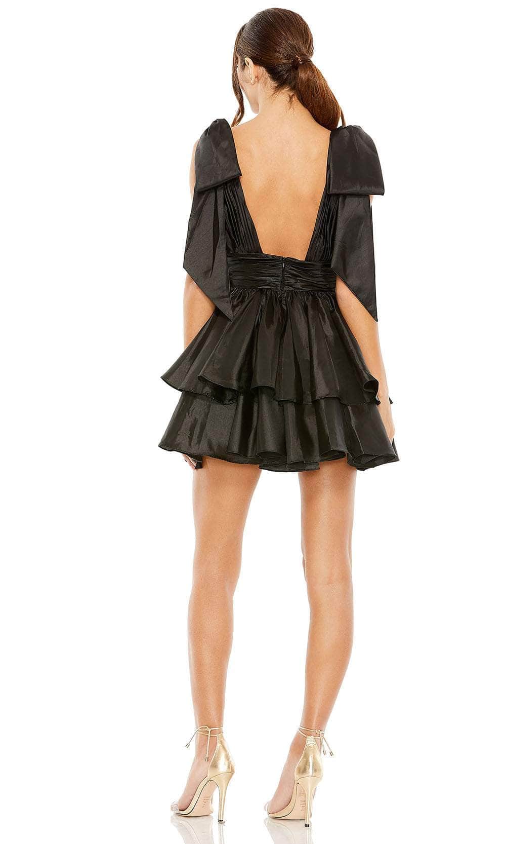 Impress the crowd with your charm as you wear this creation from Ieena Duggal 11657. The sleeveless satin dress showcases a pleated bodice with a matching plunging v-neckline and low v-open back. The wide shoulder straps have an oversized bow for a unique effect. A pleated wide band encircles the waist giving a slender look. While the A-line skirt highlights the ruffle tier design and finishes to the mid-thigh hem. Be the ultimate belle of the party in this gorgeous cocktail dress from Ieena Duggal 11657. Models are wearing the Black, and Pale Gold colors.