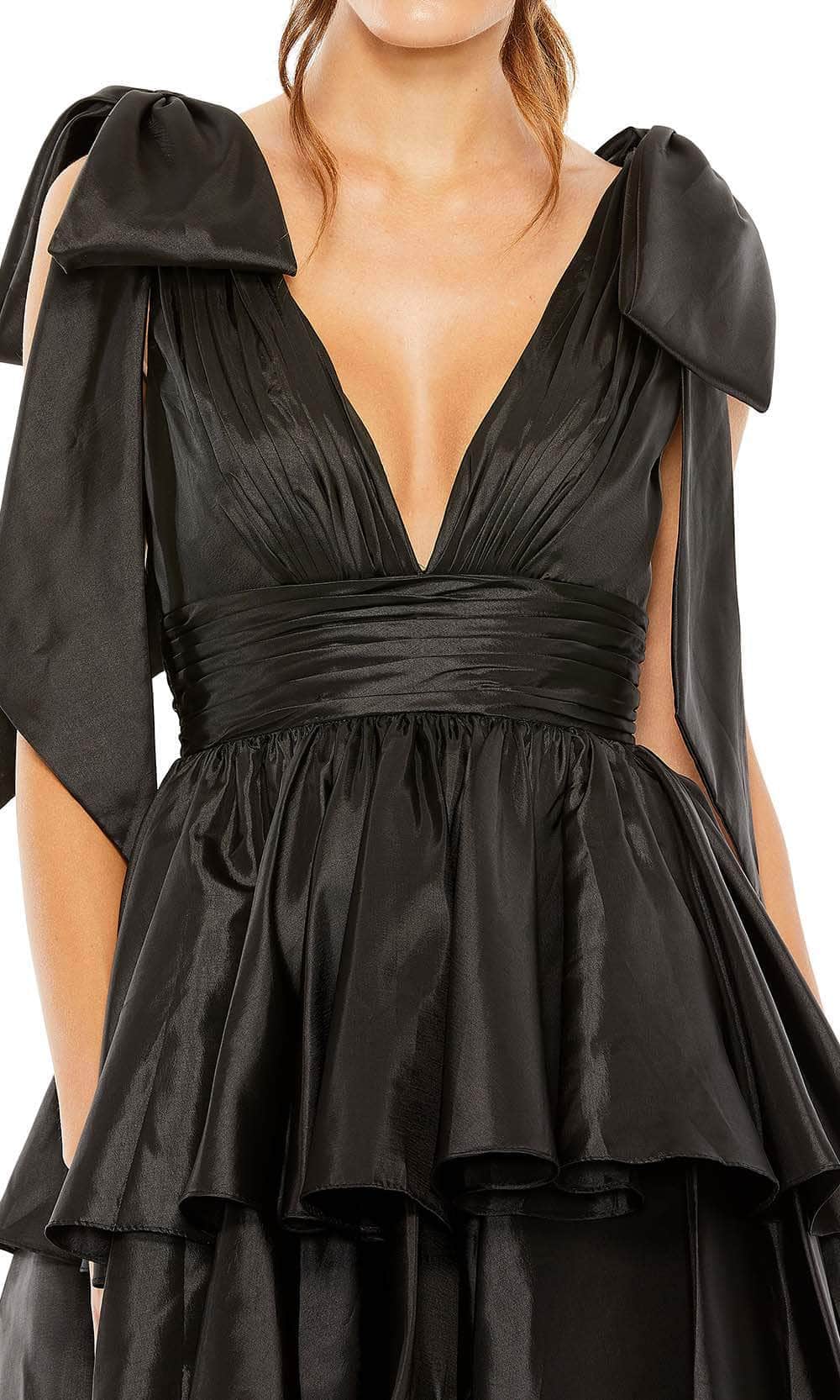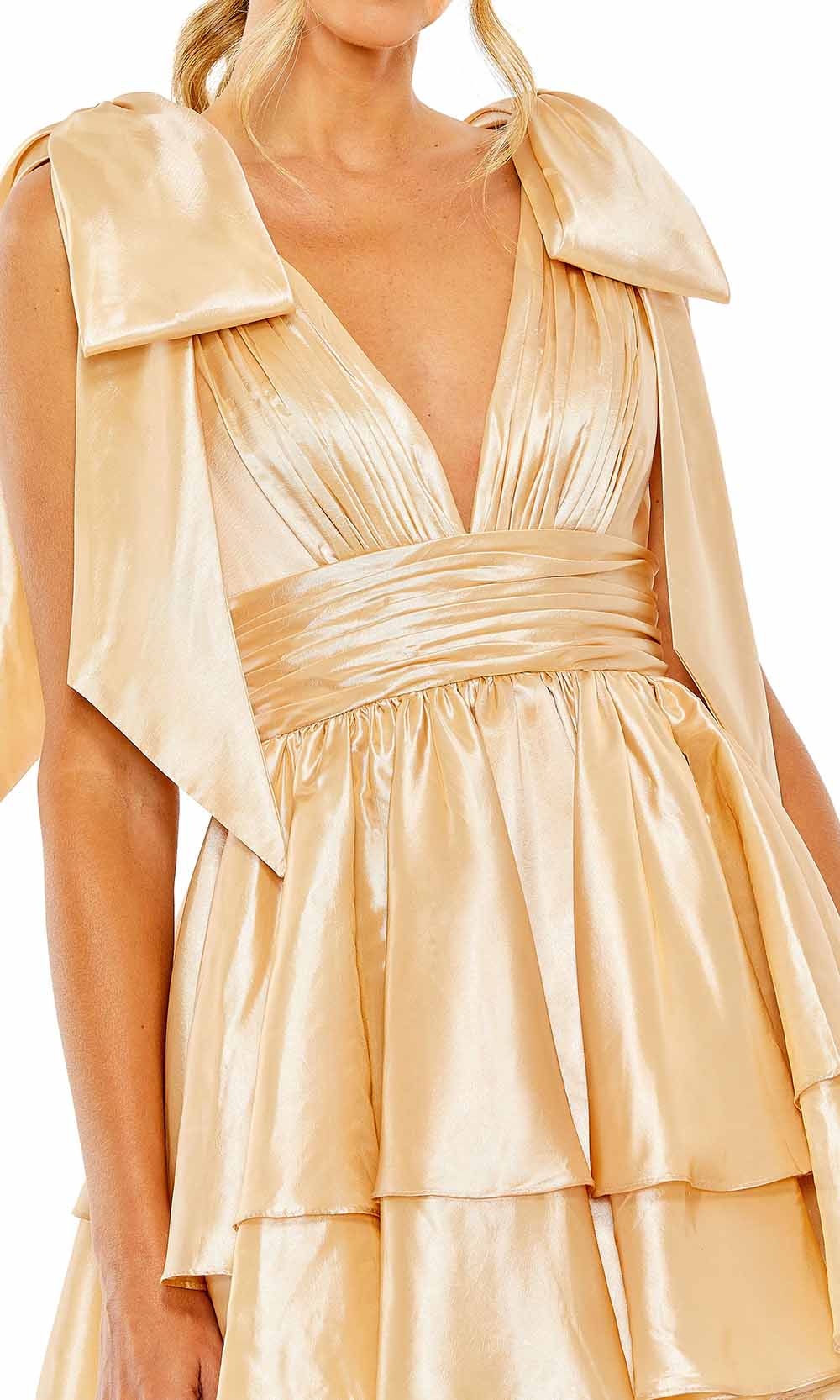 | Details: | Sleeveless, Oversized Bow Accents, Pleated, Wide Waistband, V-Back, Tiered, Ruffles |