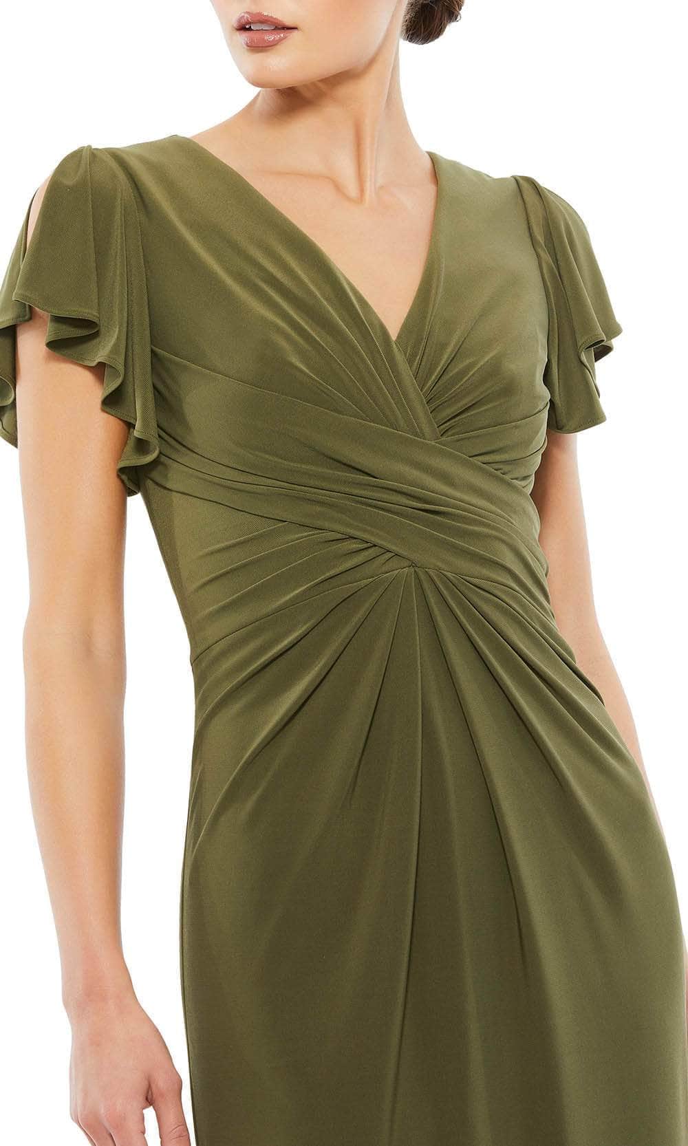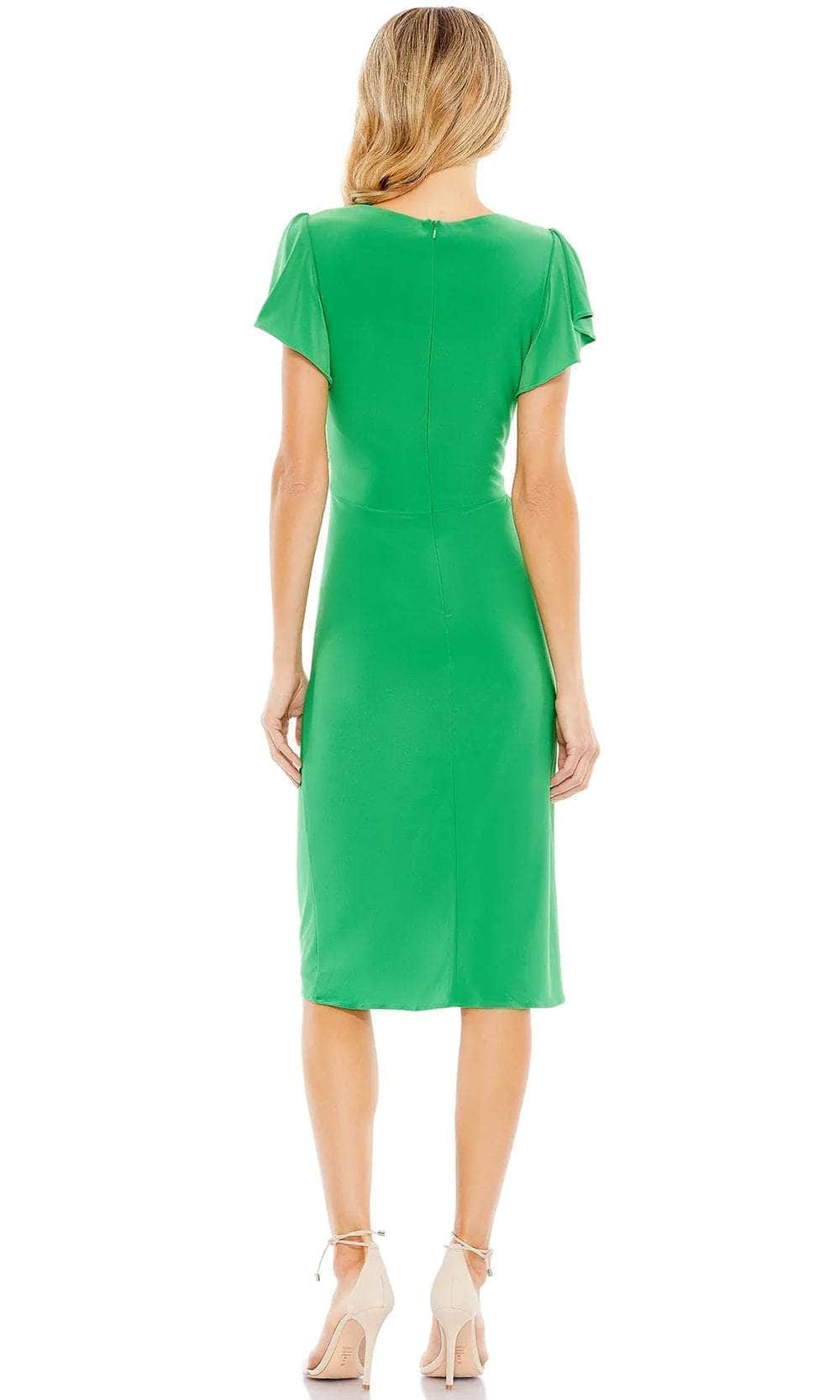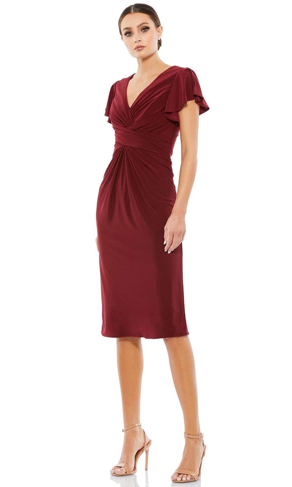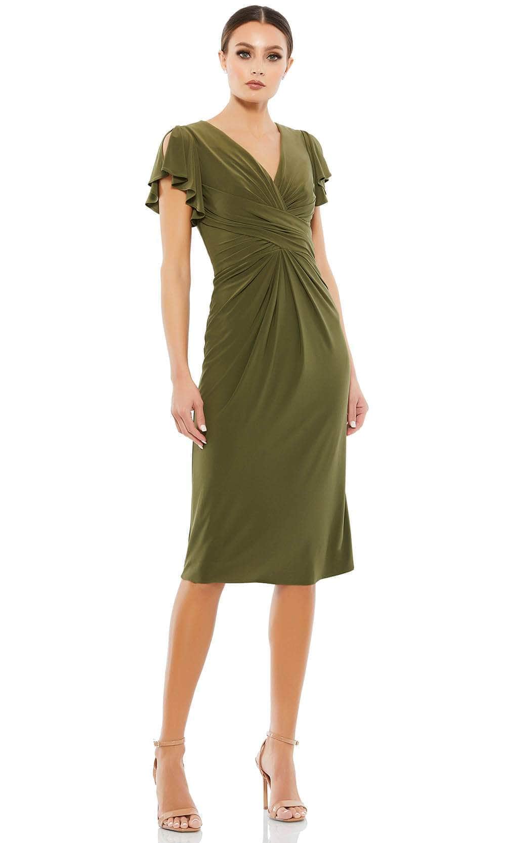 Look immaculately gorgeous in this simple yet sophisticated Ieena for Mac Duggal 12486 dress. Tailored from a jersey fabric ensuring a comfortable fit, this dress flaunts a V-neckline with a bandage and faux wrap accent at the midriff which adds fashion to the whole piece. The flutter short sleeves make your arm look slim and long, as the skirt runs at a knee-length hem, perfect for making you look taller and slimmer with its fitted silhouette. Charm everyone with the flair of this Ieena for Mac Duggal masterpiece. Models are wearing Green, Sunset, Wine, and Olive colors.