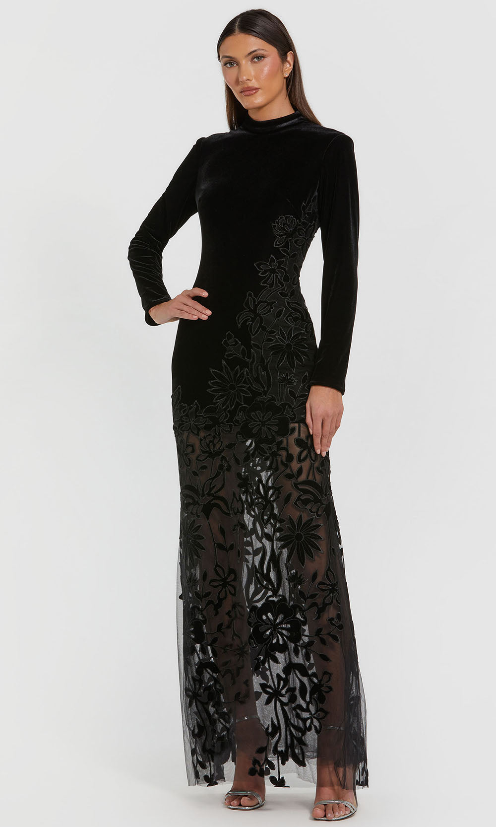 Ieena Duggal 20756 style exudes strength and grace, showcasing a refined silhouette that delivers impact through its sculpted form. A plush velvet bodice defines the upper body with a high neckline and long fitted sleeves, while the sheath skirt flows into a sheer overlay adorned with floral embroidery. This dramatic contrast of opacity and transparency adds modern romance to the silhouette. From the sleek upper fit to the whisper-light hem, the Ieena Duggal 20756 speaks to confident elegance with a fashion-forward twist. Model is wearing Black color.