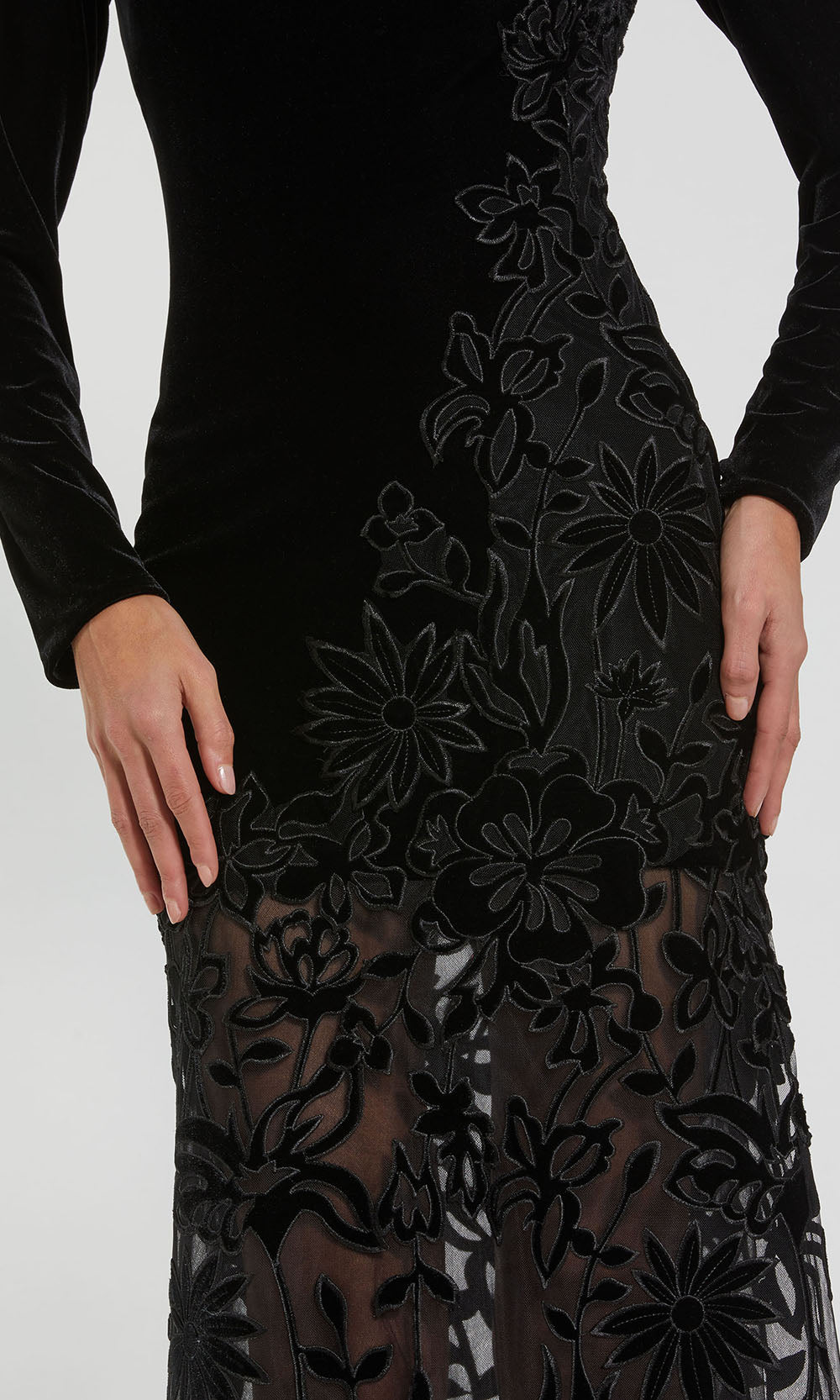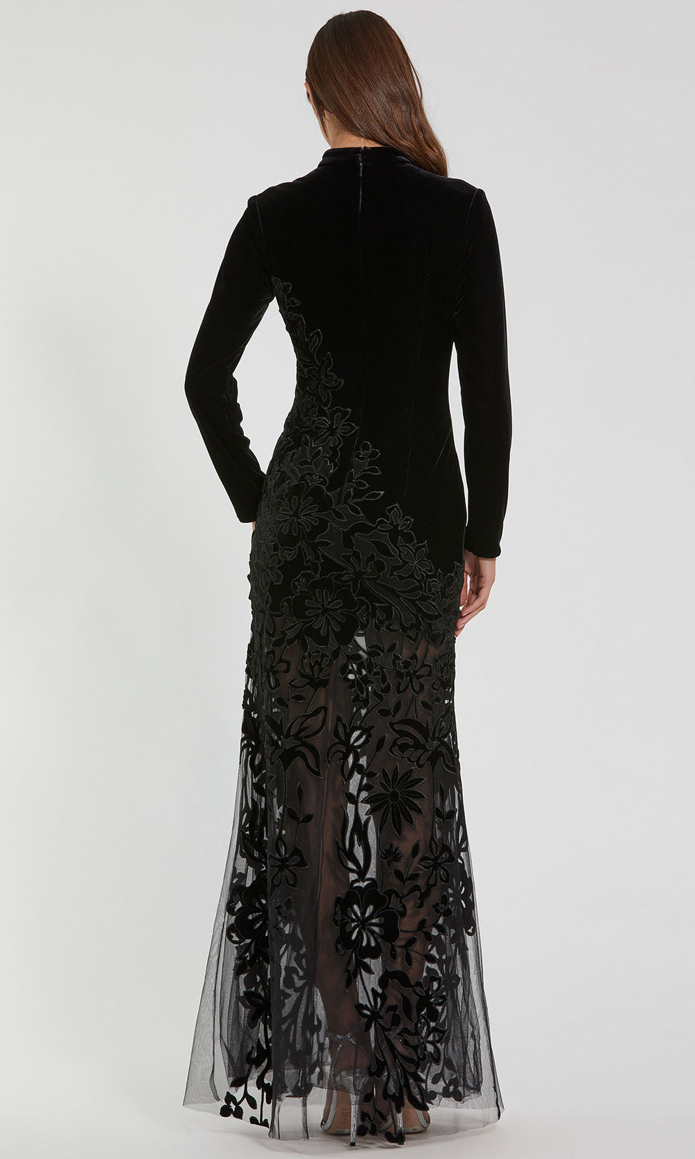 | Details: | Long Sleeves, Floral Embroidery, Sheer Skirt, Fitted, Full Back, Concealed Back Zipper |