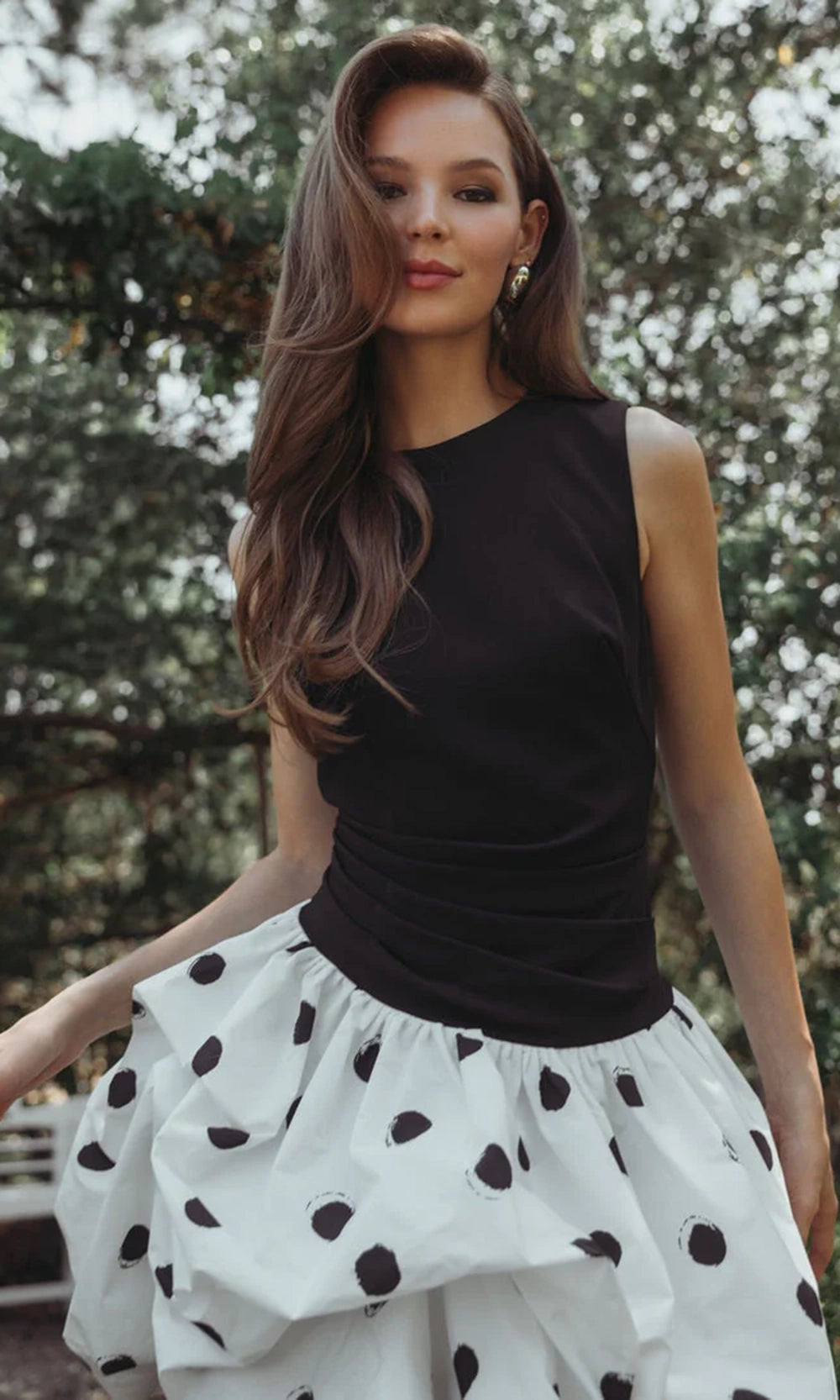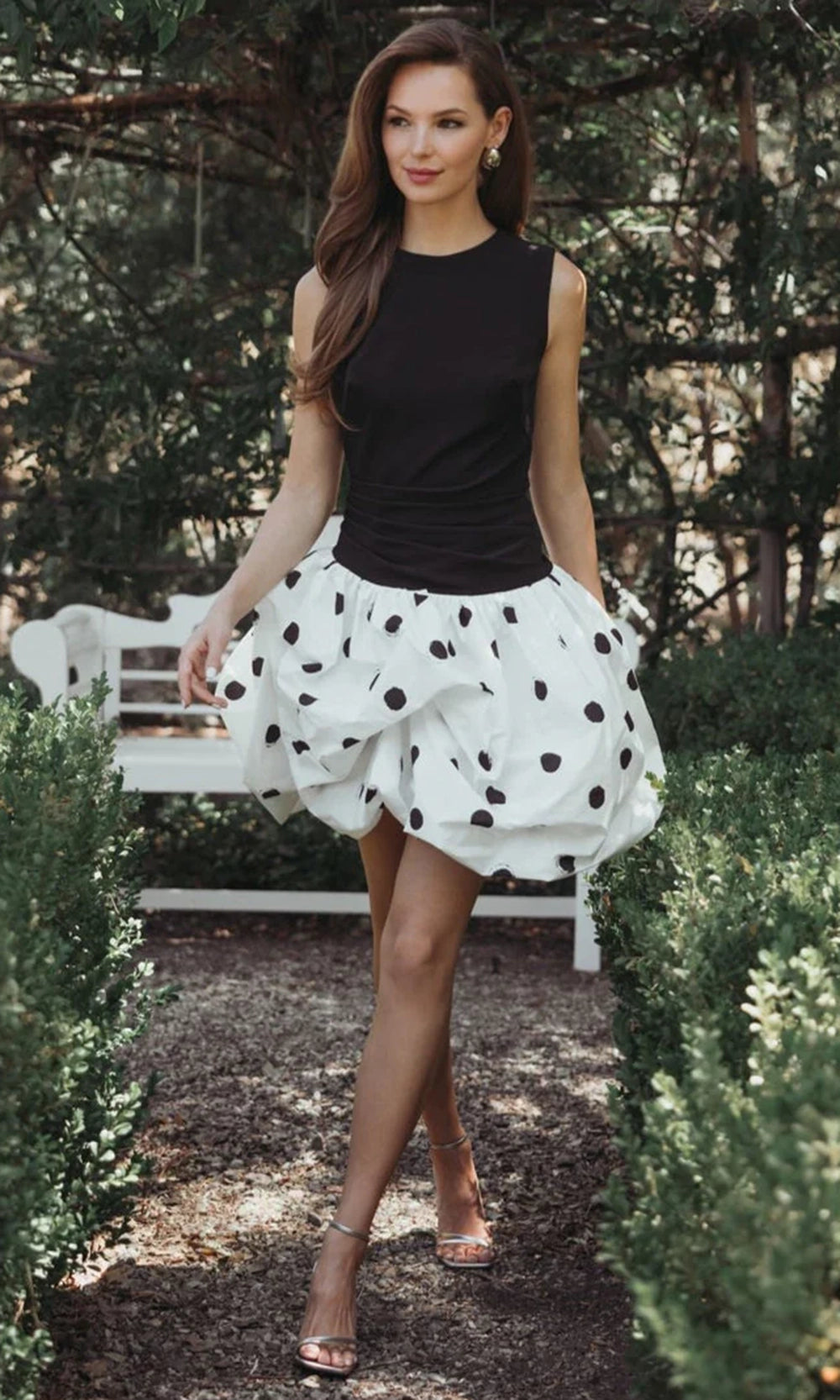 | Details: | Sleeveless Bodice, Ruched Waist, Bubble Mini Skirt, Polka Dot Print, Concealed Back Zipper |