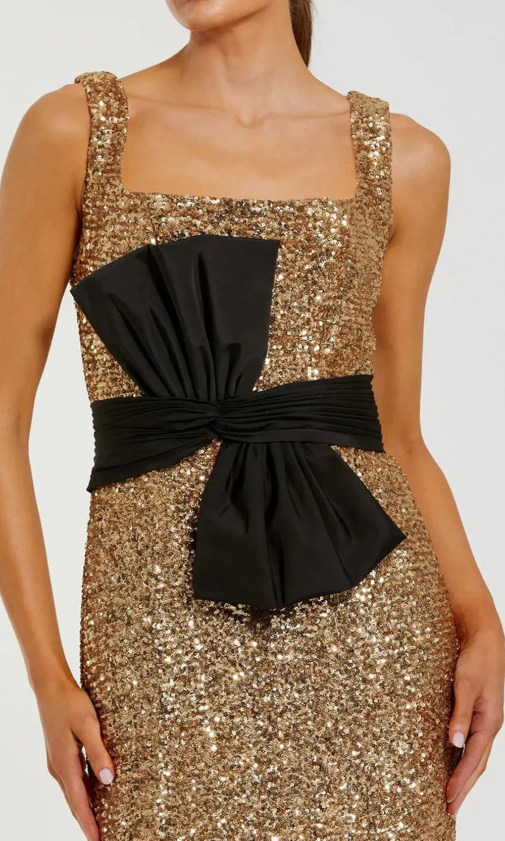 | Details: | Ruched Waistband, Oversized Faille Bow, Sleeveless, Fitted Bodice, All-Over Sequin, Square Back |