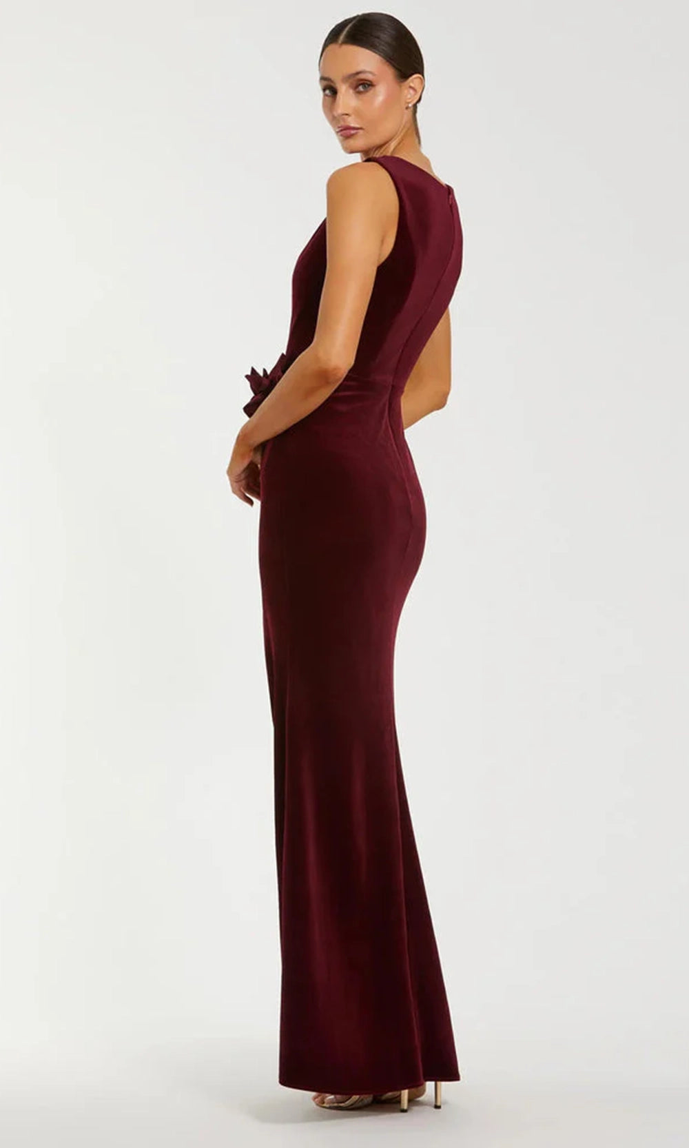 | Details: | Sleeveless Bodice, 3D Floral Applique, Draped Waist, High Slit, Full Back |