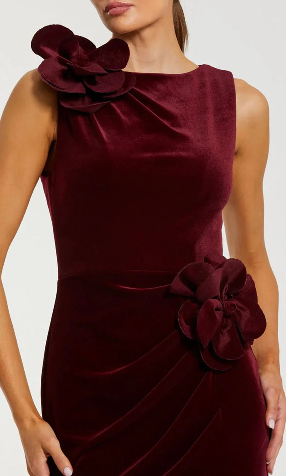 Reveal your glamorous side with the captivating charm of this Ieena Duggal 21163 gown. It is styled with a sleeveless bodice and jewel neckline, enhanced by statement 3D floral appliques on the shoulder and hip. A flattering draped effect across the waist flows into a smooth column skirt, balanced by a bold thigh-high slit that adds a contemporary edge. Elegantly structured and full of charm, the Ieena Duggal 21163 blends vintage inspiration with a modern sense of drama. Model is wearing Burgundy color.