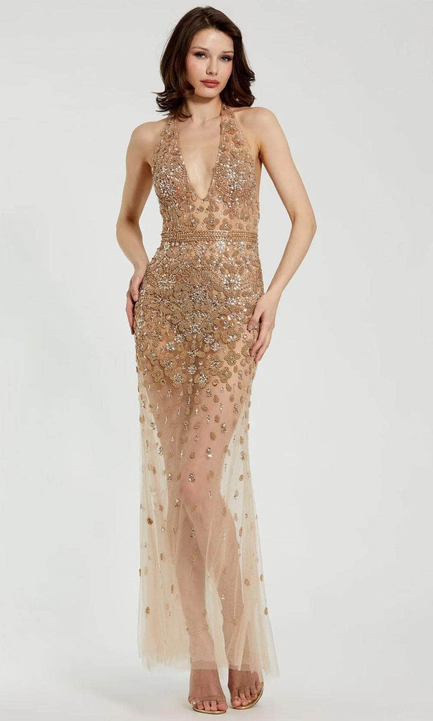| Details: | Sleeveless, Beaded, Sequined, Open Back, Concealed Zipper Closure |