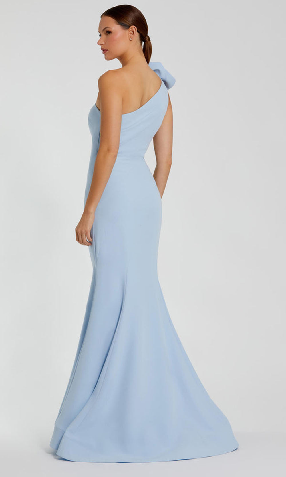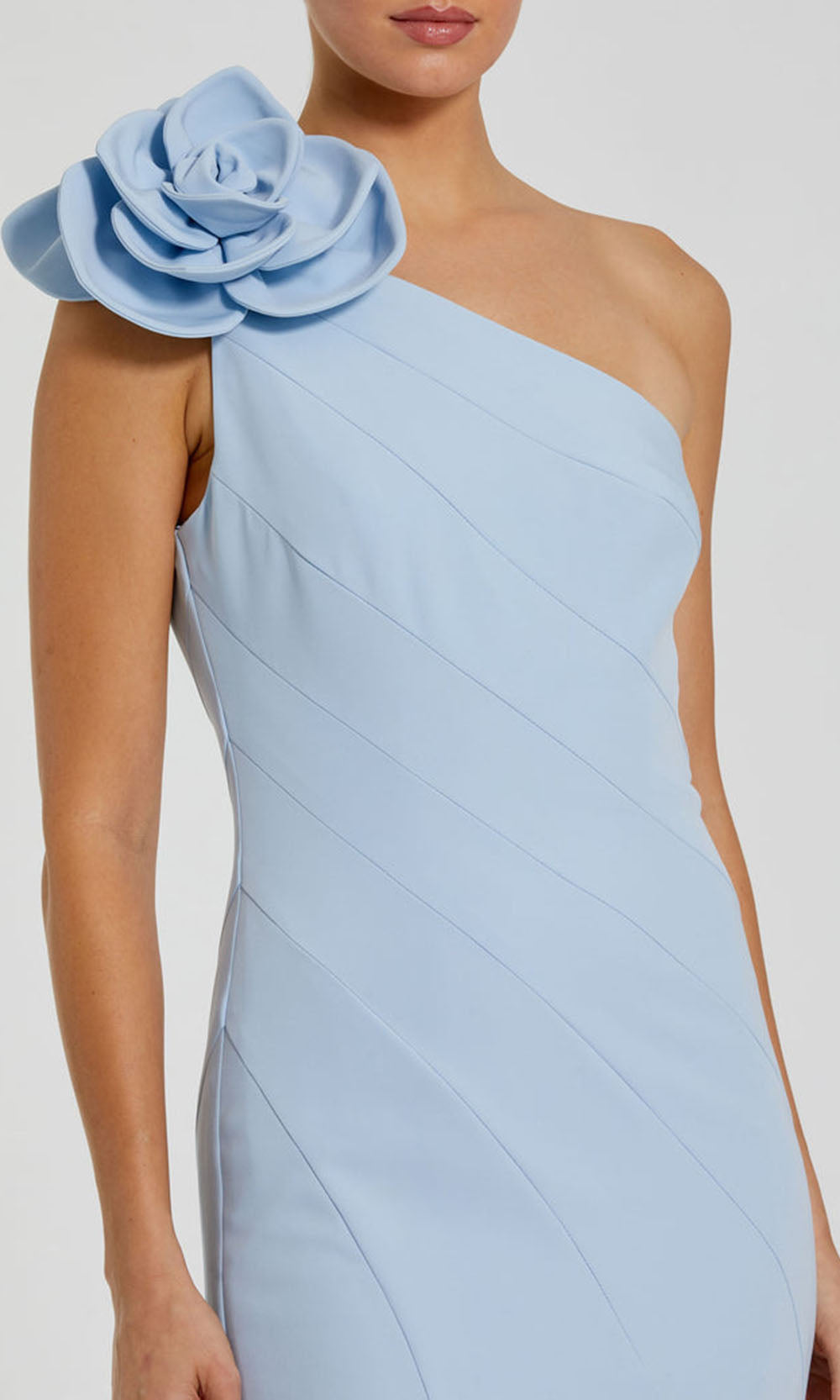 Sleek and eye-catching, the Ieena Duggal 2304 style is a refined statement of modern glamour. Its asymmetric neckline is elevated by a bold floral applique on one shoulder strap, adding sculptural drama to the structured crepe fabric. Diagonal seams sculpts the bodice and enhances the fit, creating a seamless transition into a mermaid silhouette that hugs the figure through the hips before gently flaring at the hem. Clean lines and thoughtful detailing make Ieena Duggal 2304 dress an ideal choice for formal affairs that call for elevated fashion and graceful refinement. Model is wearing Powder Blue color.