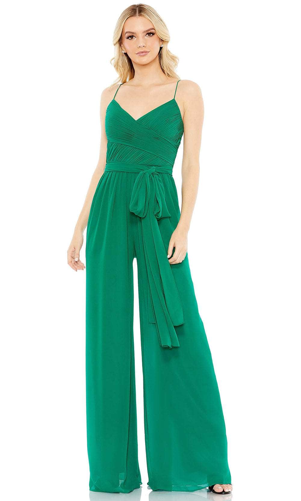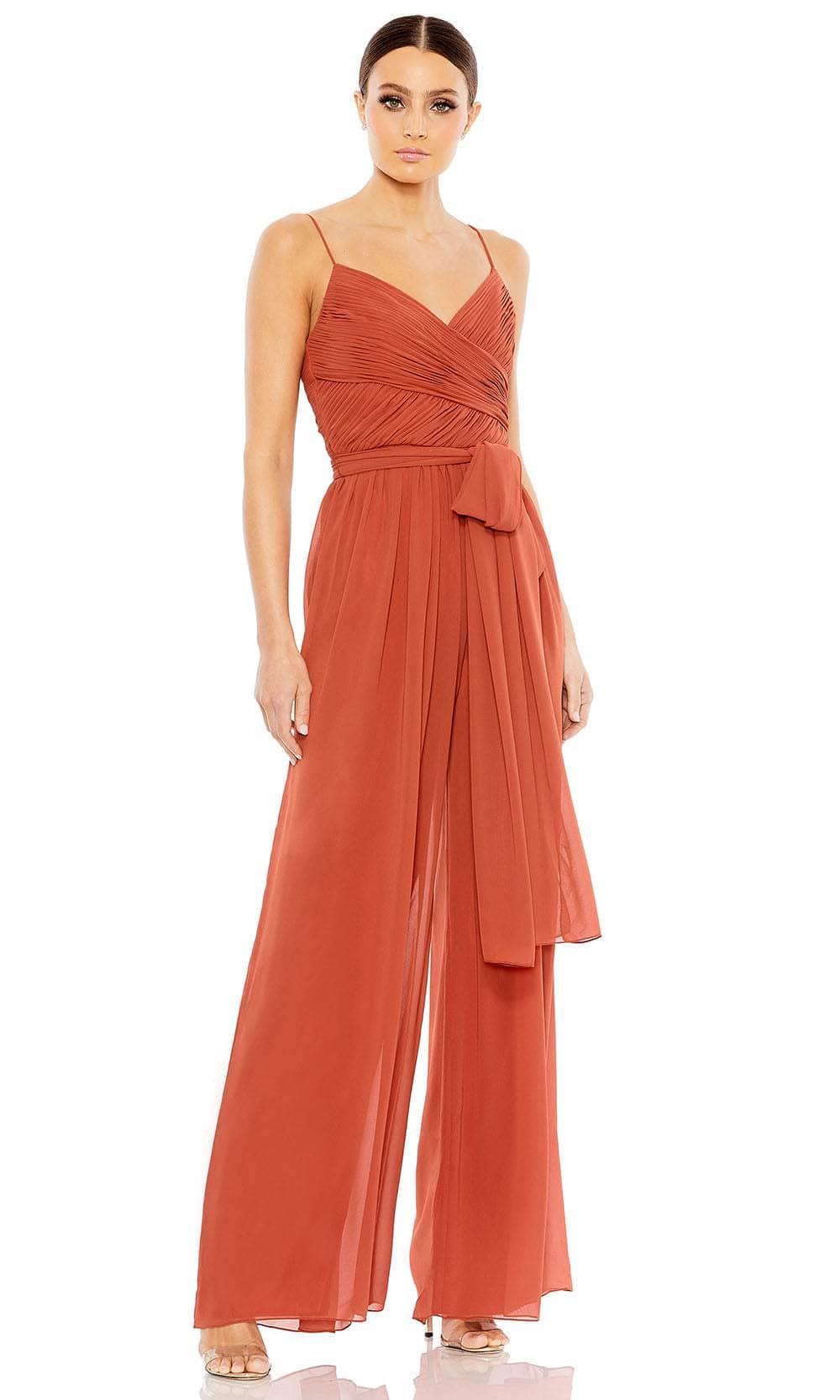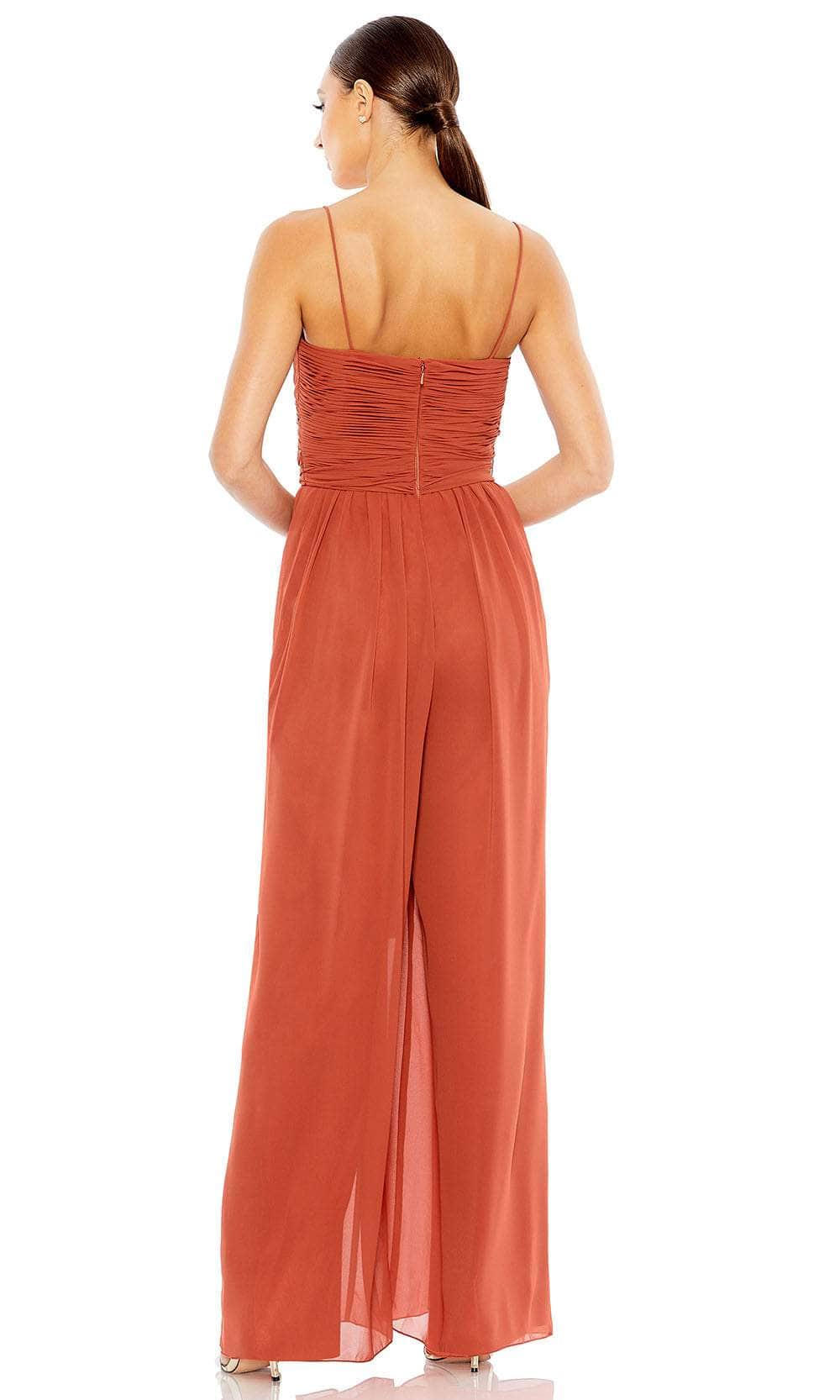 Fall in love with the striking beauty of the Ieena Duggal 2651 masterpiece. Showcasing directional ruching on the bodice, this jumpsuit is both stylish and comfortable. The spaghetti straps offer beautiful support to the v-neckline and mid-open back. The self-tie waistband allows you to customize the fit to your liking. This jumpsuit silhouette is completed in straight wide-leg pants that fall to the full length hemline. This Ieena Duggal 2651 design is perfect for making a statement. Models are wearing Cinnamon, and Emerald colors.