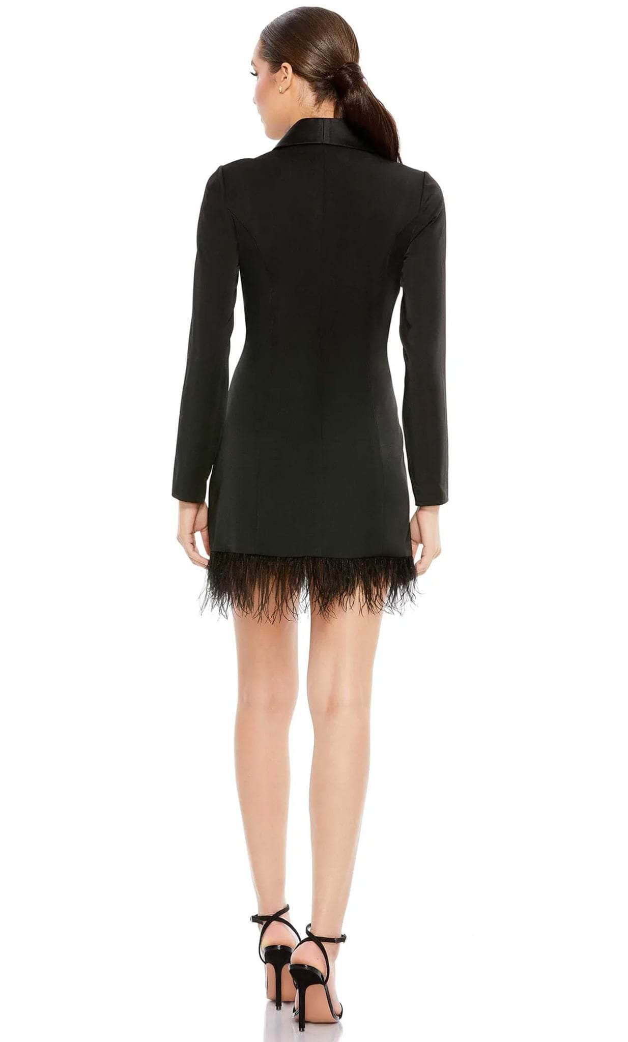 Project a sensuously confident vibe as you walk into that spectacular event in style in this Ieena Duggal 26510 creation. A mini-length extended tuxedo dress complete with a notched lapel collar, framed with long sleeves, and a bodice crafted with clean seams and a front button for an elegant look. The skirt with feathered hemline flaunts a sheath silhouette. This Ieena Duggal 26510 masterpiece will make you stand out at your opulent event. Model is wearing Black color.