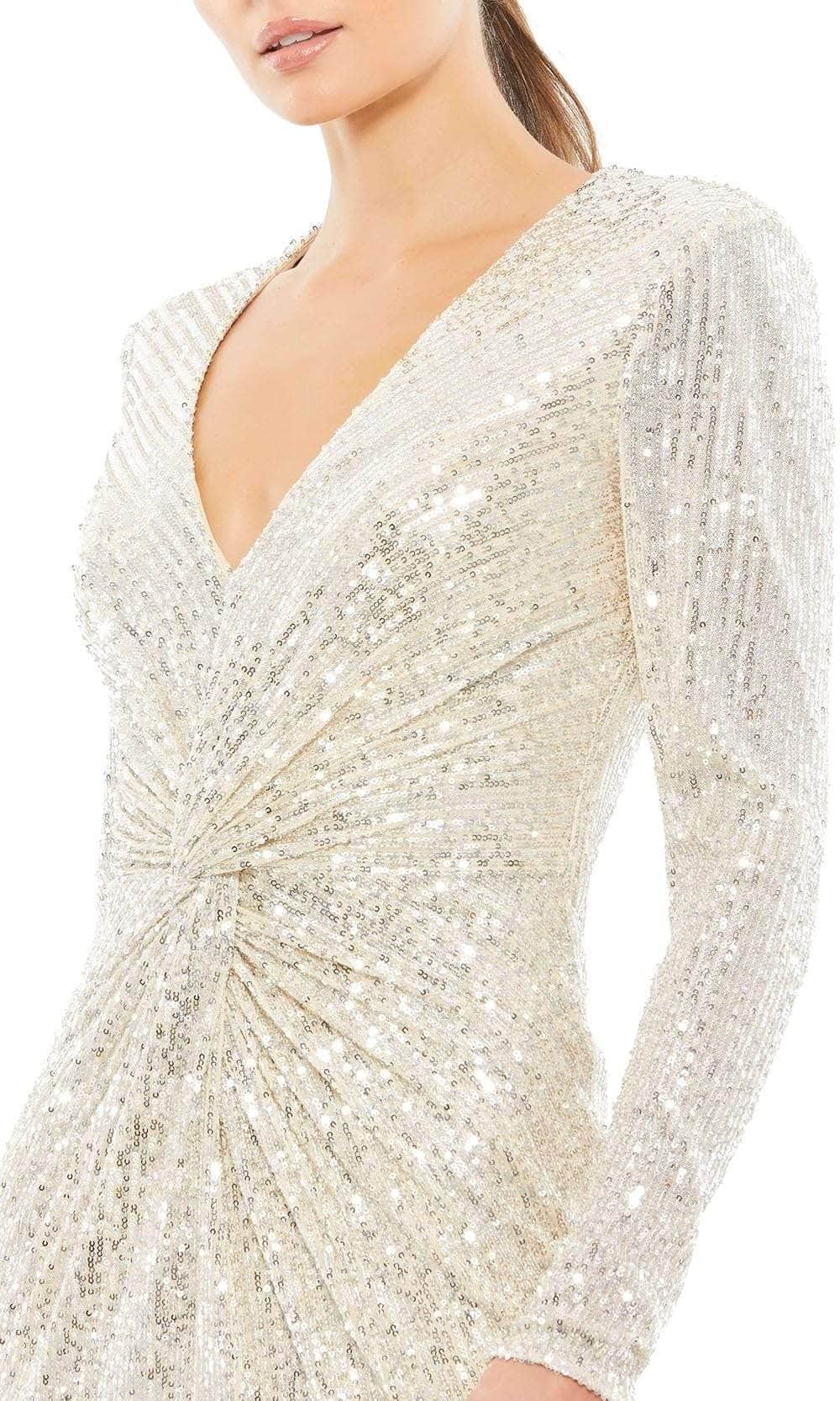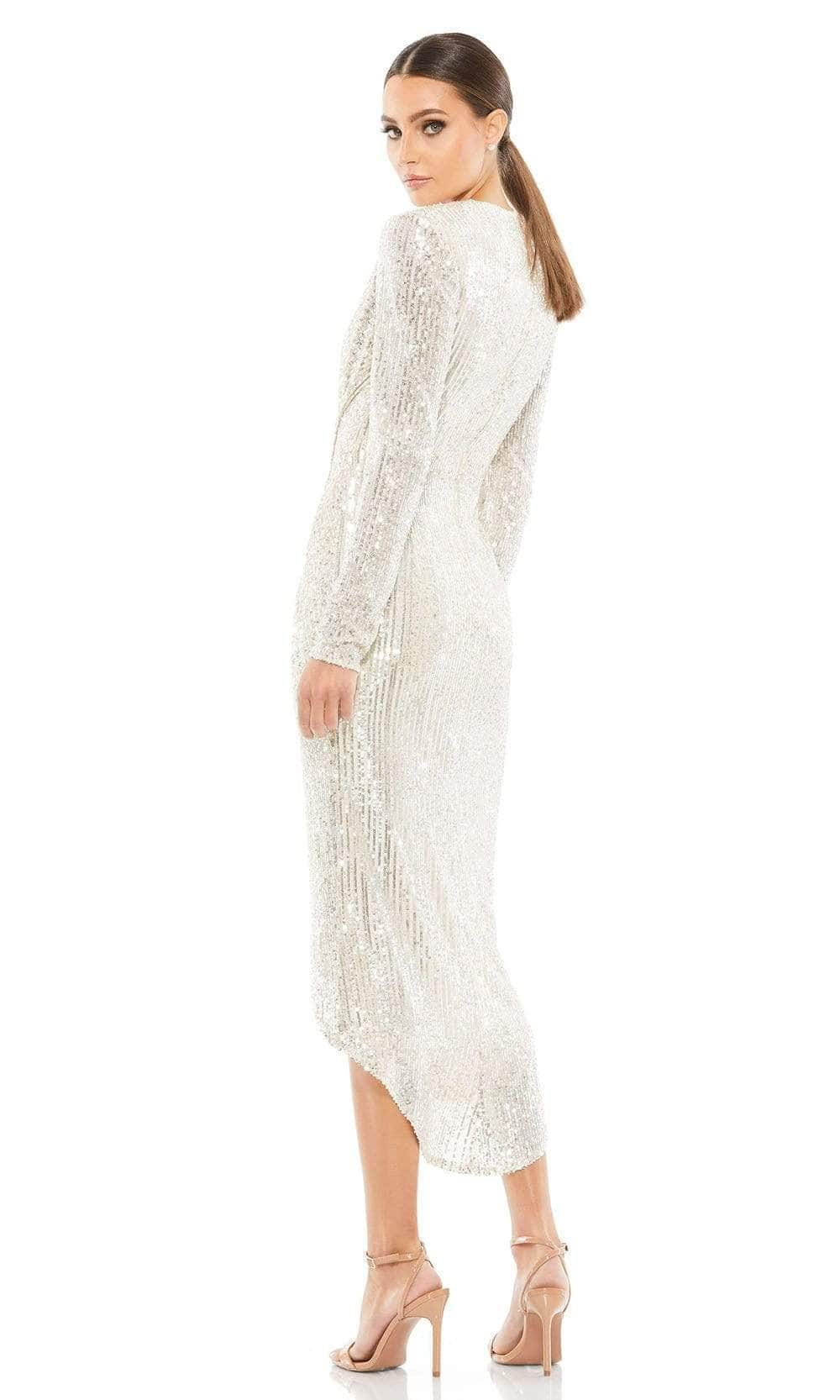 Radiate a chic style in this Ieena Duggal 26549 creation. Embellished with scintillating sequins, this dress parades a plunging v-neckline paired with a full back. Rendered with ruching to create a twist front bodice, this long sleeve stunner finishes with a high low sheath skirt. Leave a trail of fascinated admirers in this Mac Duggal masterpiece.