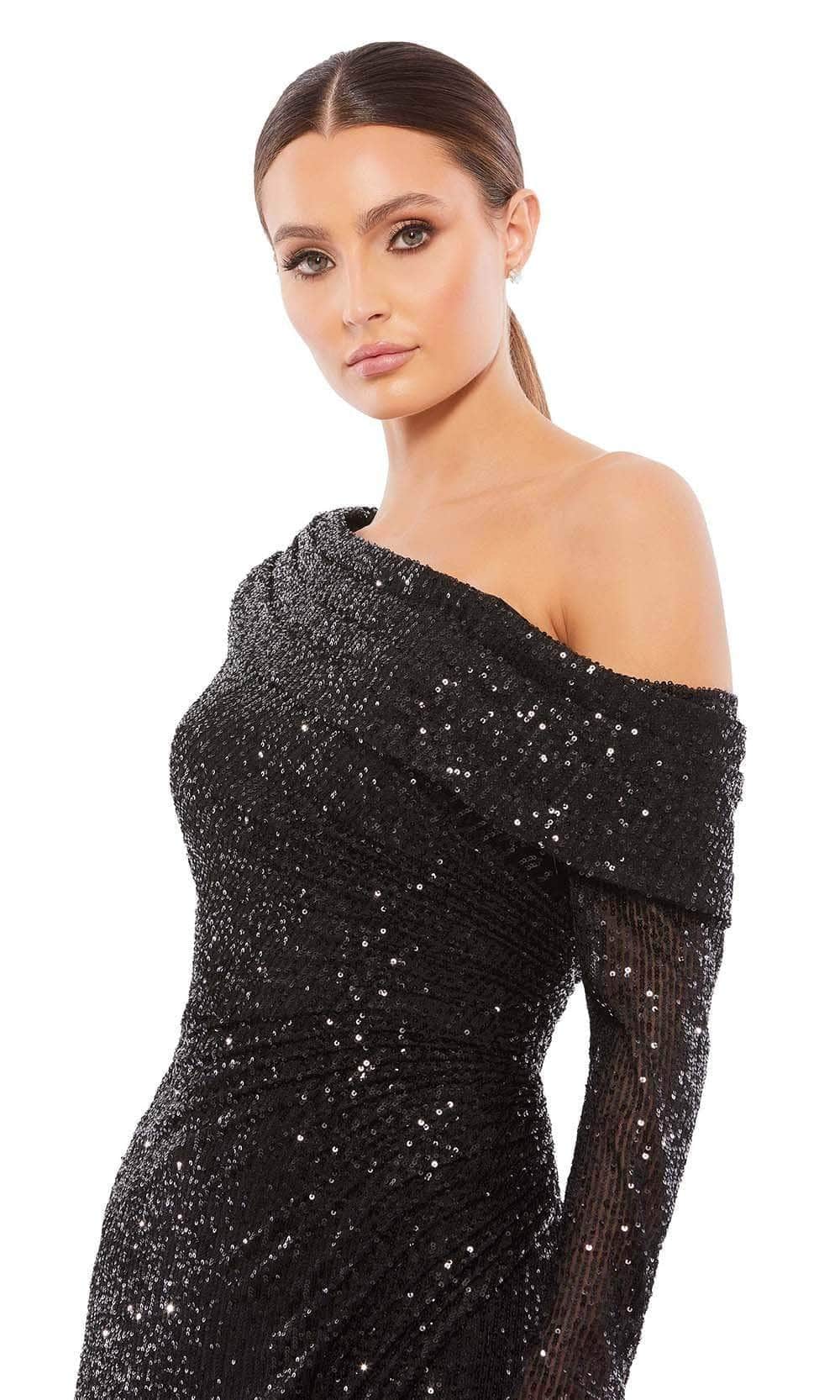 | Details: | Sequins, Long Sleeve, Draped Foldover, Mid-Open Back, Zipper Closure, High Slit, Tea Length Hem |