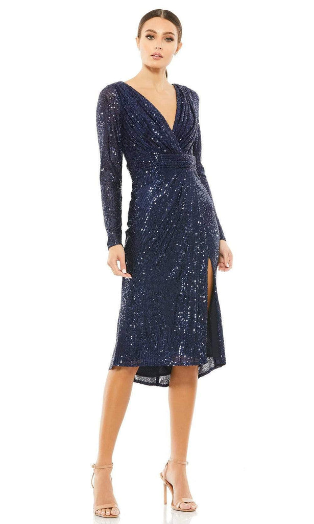 | Details: | Sequins, Ruching, Long Sleeves, High Slit, Full Back, Zipper Closure, Knee Length Hem |