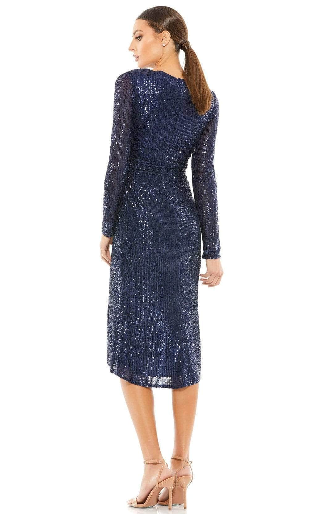 Unleash that sultry goddess in you in this scintillating Ieena Duggal 26555 creation Flourishing shimmering sequins allover its length, this dress reveals a v-neckline and a full back. Draped and gathered with a pleated waistband, the sheath skirt parts with a slit and ends with a knee length hemline. Shimmer on the red carpet in this Mac Duggal masterpiece.
