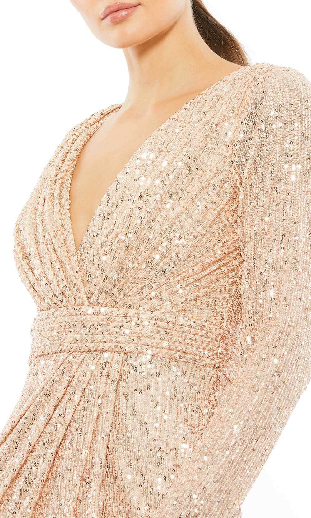 | Details: | Sequins, Ruching, Long Sleeves, High Slit, Full Back, Zipper Closure, Knee Length Hem |