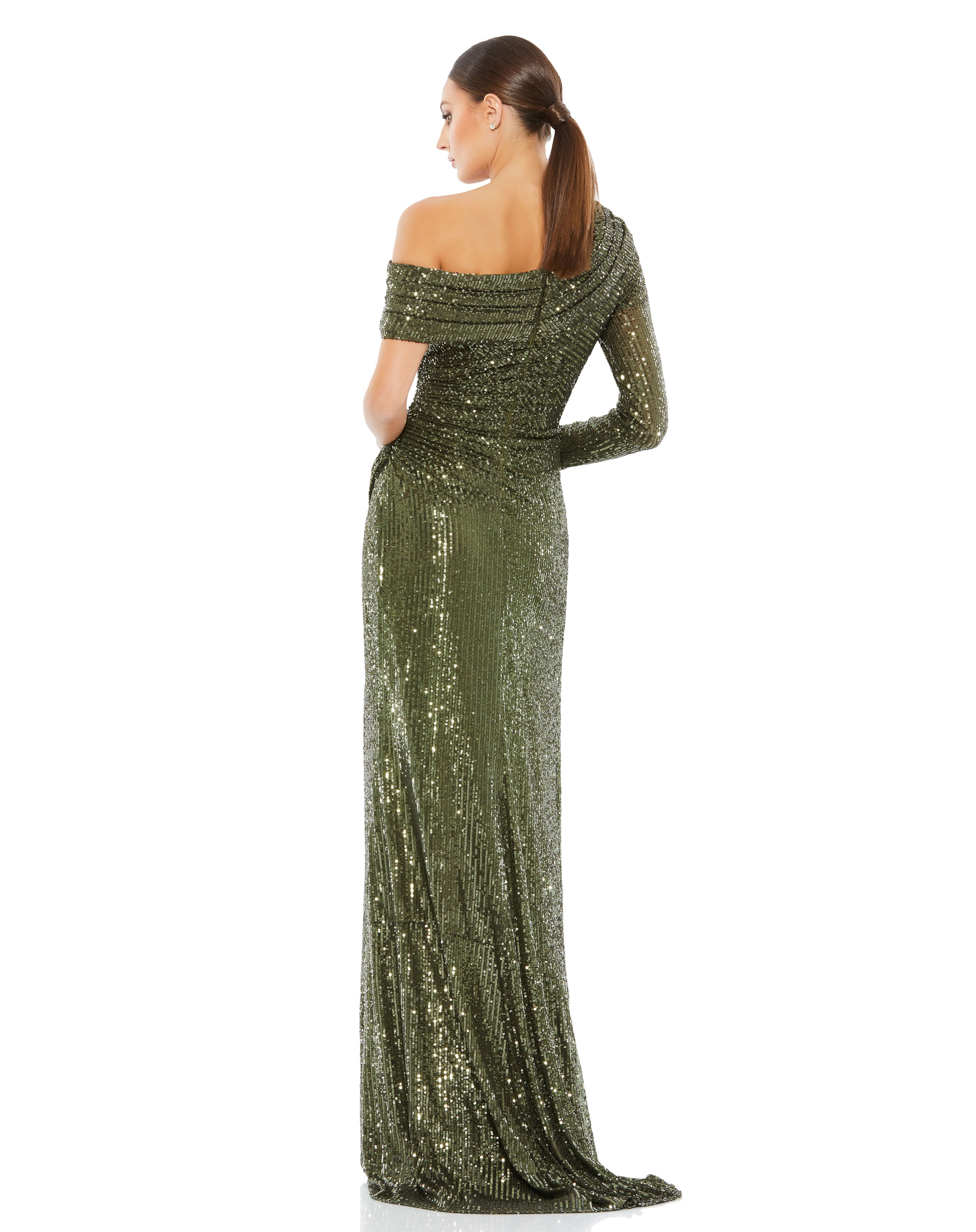 Be swept away by the beauty of this Ieena Duggal 26571 creation. Embellished with glittering sequins on a fitted silhouette, this gown parades a one shoulder neckline with a foldover drape. Detailed with a slender long sleeve, the sheath skirt reveals a slit as it falls into a train. Charm everyone with the flair of this Ieena Duggal masterpiece. Exquisite attention to detail is the hallmark of Mac Duggal dresses. Mac Duggal dresses encapsulate the very essence of the women who wear them, reflecting their confidence, feminine power, and inner beauty.