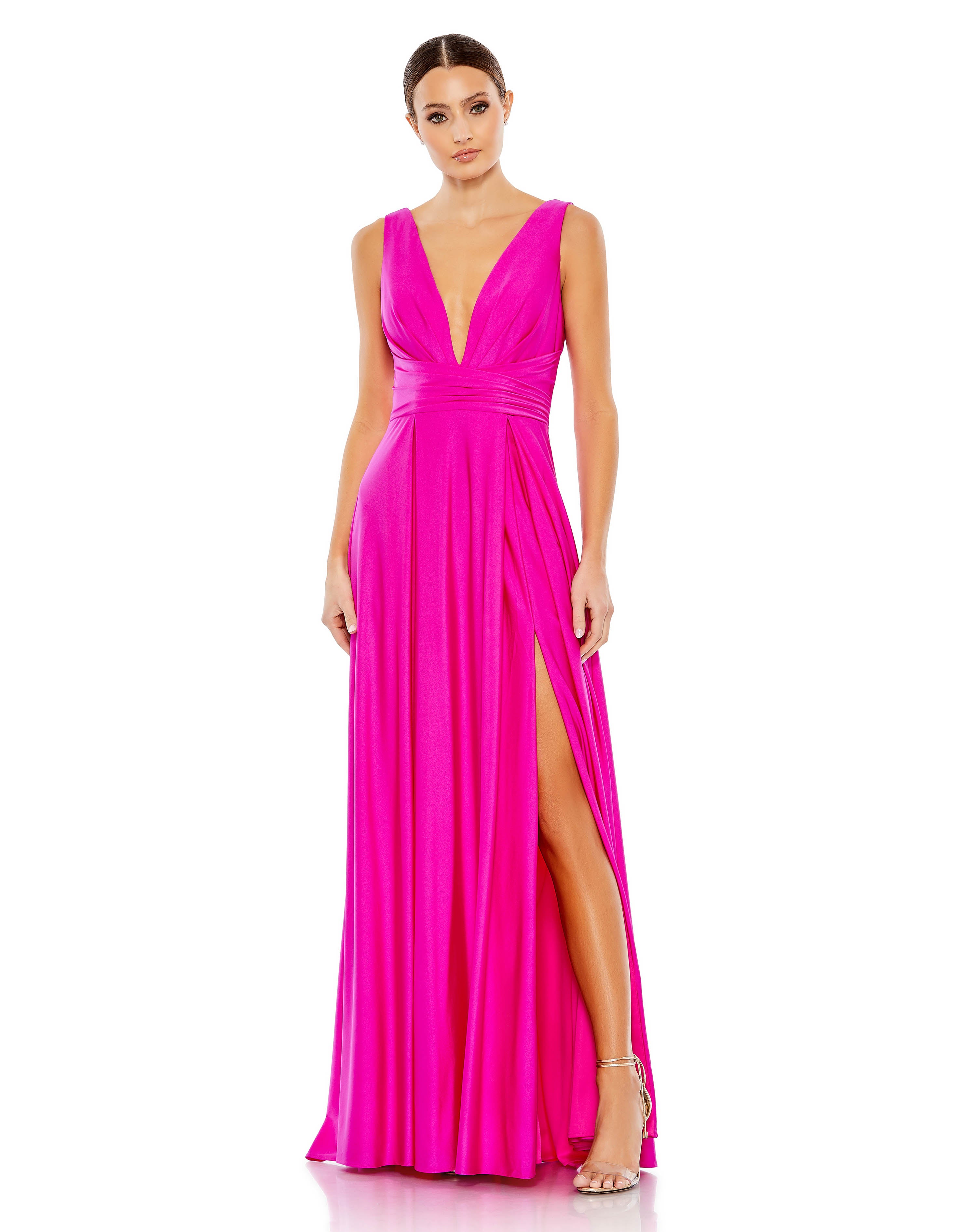 | Details: | Sleeveless, Wide Strap, Ruched, Wide Waistband, V-Back, Back Zipper, Box-Pleated, High Slit |