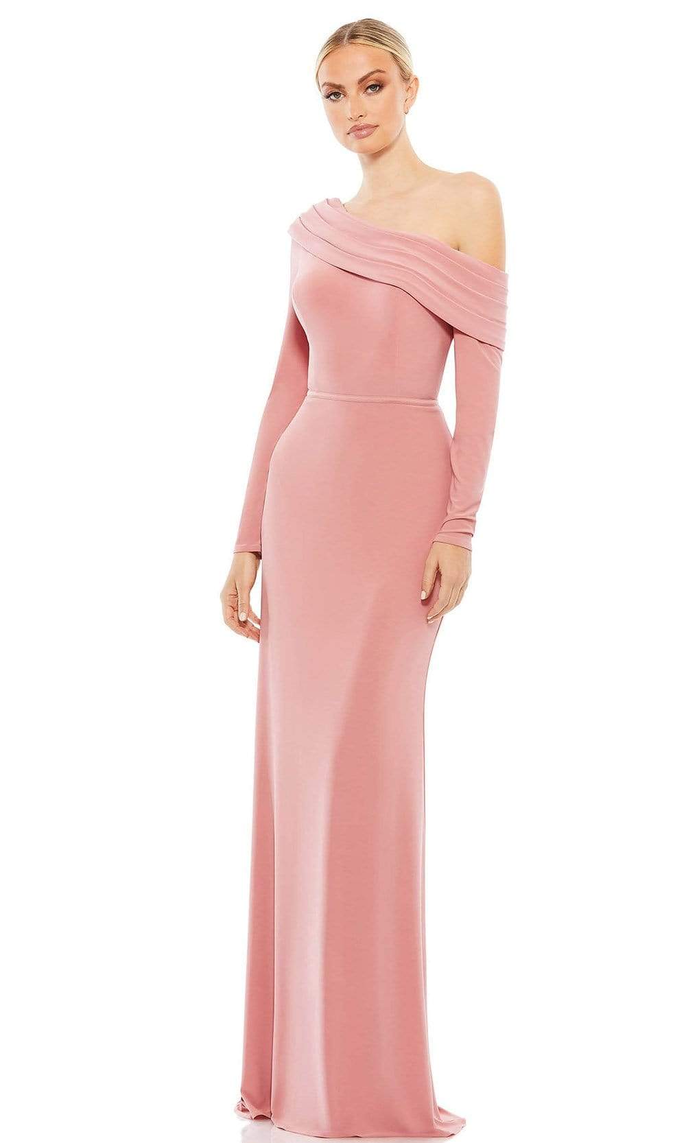 Orchestrate a spectacular evening of dazzling sophistication in this luxurious Mac Duggal 26595. Flatter your finest assets in this crepe-made evening dress. It has minimalist style as it has no embellishments allover but features a pleated asymmetrical neckline on a fit bodice. It uses long sleeves and a wondrous sheath silhouette in full length with a train. This Mac Duggal design is sure to bring you an unforgettable romantic evening!